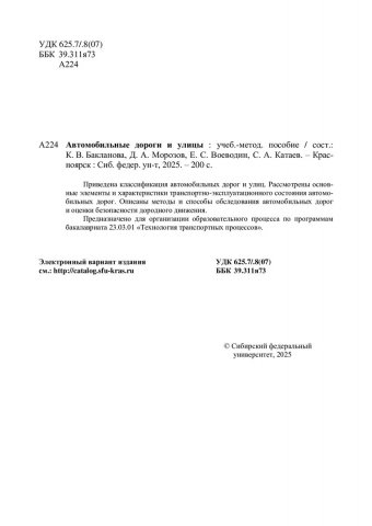 Библиографическое описание: Автомобильные дороги и улицы : [практические работы]: учебно-методическое пособие / Сибирский федеральный университет ; сост. К. В. Бакланова, Д. А. Морозов, Е. С. Воеводин, А. А. Катаев. - Электрон. текстовые дан. (6,0 Мб). - Красноярск : СФУ, 2025 (2025-02-14). - 200 с., 11.0 усл. печ. л. : ил., цв.ил., табл. - Загл. с титул. экрана. - Электрон. версия печ. публикации . - Библиогр.: с. 167-169. - 100 экз. - Изд. № 2025-23815 : Б. ц. - Текст : электронный.