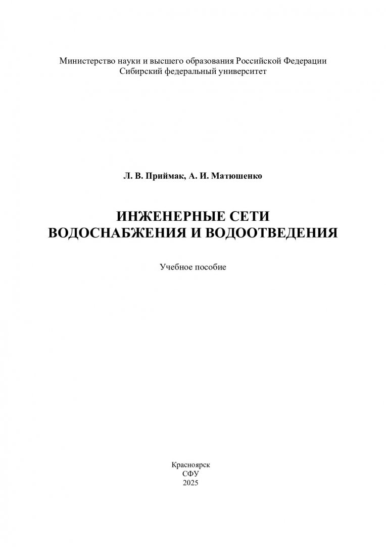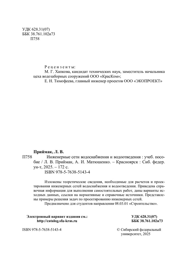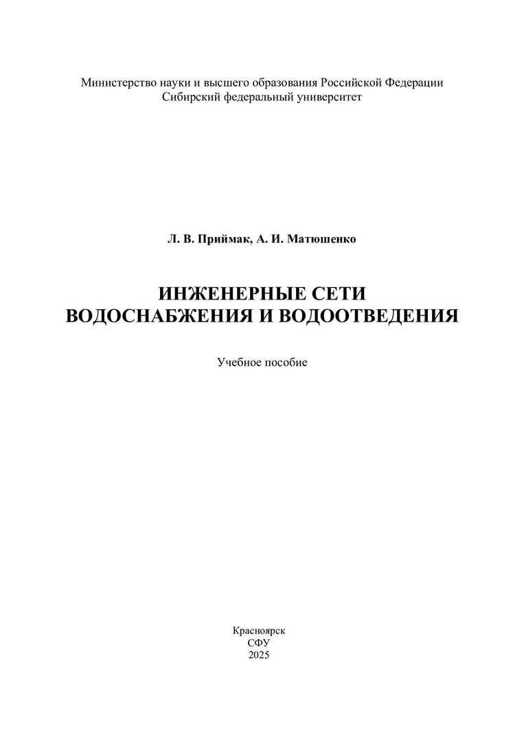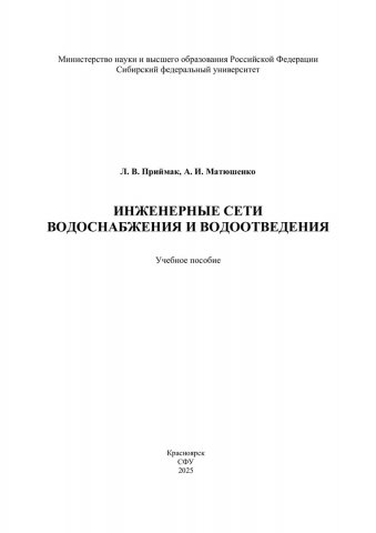 Библиографическое описание: Приймак, Лилия Владимировна. Инженерные сети водоснабжения и водоотведения : учебное пособие / Л. В. Приймак, А. И. Матюшенко ; рец.: М. Г. Хапкова, Е. Н. Тимофеева ; Сибирский федеральный университет, Инженерно-строительный институт. - Электрон. текстовые дан. (pdf, 3.8 Мб). - Красноярск : СФУ, 2025 (2025-10-16). - 172 с., 10.8 усл. печ. л. : рис., табл. - Загл. с титул. экрана. - Электрон. версия печ. публикации . - Библиогр.: с. 149-151. - 100 экз. - ISBN 978-5-7638-5143-4 : Б. ц. - Изд. № 2025-24653. - Текст : электронный.