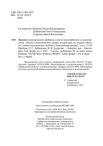 Библиографическое описание:Эколого-экономические проблемы систем водоснабжения и водоотведения. Эколого-экономическая оценка воздействия на водные объекты : учебно-методическое пособие [для студентов напр. подг. 08.03.01 «Строительство» (профиль 08.03.01.0006 «Водоснабжение и водоотведение»), 20.03.01 «Природообустройство и водопользование» (профиль 20.03.01.0006 «Инженерные системы сельскохозяйственного водоснабжения, обводнения и водоотведения»)] / Сиб. федер. ун-т, Инж.-строит. ин-т ; сост.: Л. В. Приймак, О. Г. Дубровская, И. В. Андруняк. - Электрон. текстовые дан. (PDF, 948 Кб). - Красноярск : СФУ, 2015. - Загл. с титул. экрана. - Библиогр.: с. 31. - Изд. № 2015-992. - Текст : электронный.