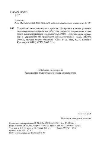 Библиографическое описание:Зеер, Владимир Андреевич. Устройство автотранспортных средств : программа и методические указания / В. А. Зеер, Ю. И. Корейбо ; Красноярский государственный технический университет. - Электрон. текстовые дан. (pdf ; 1,2 Мб). - Красноярск : ИПЦ КГТУ, 2005. - 32 с. : табл. - (Учебно-методическая литература). - Загл. с титул. экрана. - Электрон. версия печ. публикации . - Текст : электронный.