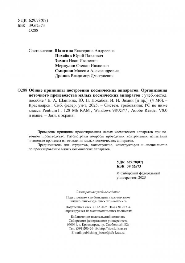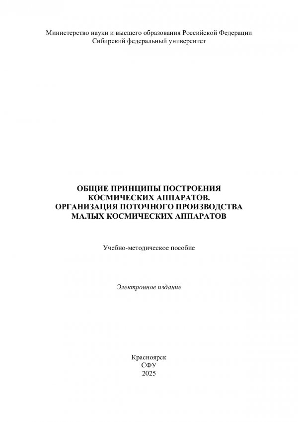 Библиографическое описание:Общие принципы построения космических аппаратов. Организация поточного производства малых космических аппаратов : учебно-методическое пособие / Сиб. федер. ун-т, Ин-т космич. и информ. технологий ; сост. Е. А. Шангина [и др.]. - Электрон. текстовые дан. (pdf, 4.6 Мб). - Красноярск : СФУ, 2025 (2025-12-30). - 73 с. - Загл. с титул. экрана. - Изд. № 2025-25734 : Б. ц. - Текст : электронный.
