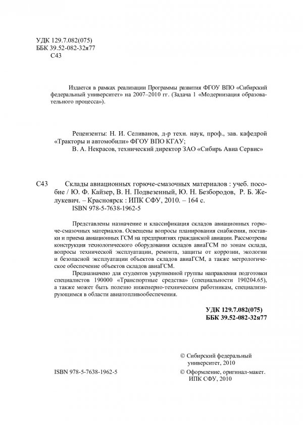 Библиографическое описание: Склады авиационных горюче-смазочных материалов : учеб. пособие для студентов вузов / Ю. Ф. Кайзер [и др.] ; Сиб. федерал. ун-т. - Красноярск : ИПК СФУ, 2010. - 162 с. : ил. - Библиогр.: с. 159-160. - 150 экз. - ISBN 978-5-7638-1962-5. - Текст : непосредственный + Текст : электронный.