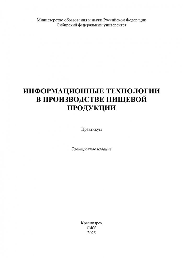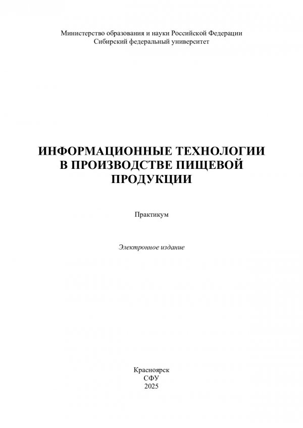 Библиографическое описание:Информационные технологии в производстве пищевой продукции : практикум / Сибирский федеральный университет, Институт торговли и сферы услуг ; сост. О. В. Гоголева. - Электрон. текстовые дан. (pdf, 1.5 Мб). - Красноярск : СФУ, 2025 (2025-12-22). - 33 с. - Загл. с титул. экрана. - Библиогр.: с. 33. - Изд. № 2025-25663 : Б. ц. - Текст : электронный.