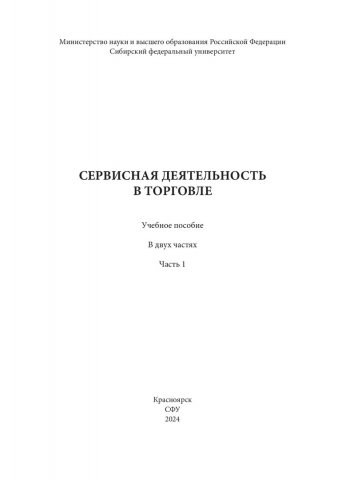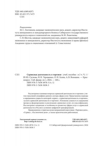 Библиографическое описание:Сервисная деятельность в торговле : учебное пособие: в 2 частях / Ю. Ю. Суслова, Н. Н. Терещенко, О. Н. Есина, А. В. Волошин ; рец.: М. С. Злотников, С. Н. Шестов ; Сибирский федеральный университет, Институт торговли и сферы услуг. - Электрон. текстовые дан. (10,9 Мб). - Красноярск : СФУ, 2024 - . - Загл. с титул. экрана. - Электрон. версия печ. публикации . - ISBN 978-5-7638-5038-3. - Текст : электронный. Ч. 1. - 2024 (2024-08-30). - 160 с., 10.0 усл. печ. л. - Библиогр.: с. 132-138. - 100 экз. - ISBN 978-5-7638-4978-3 : Б. ц. - Изд. № 2024-21667
