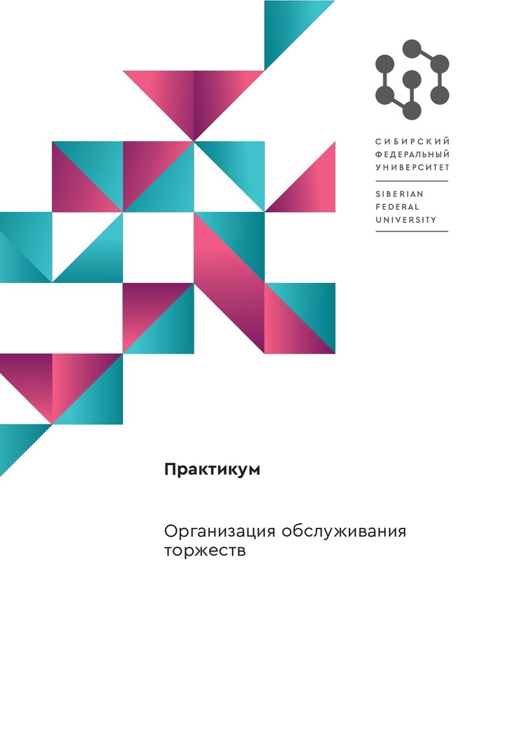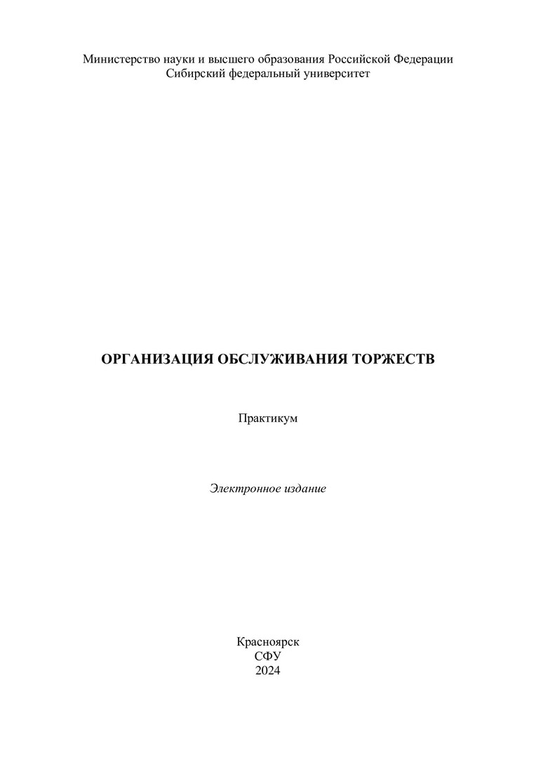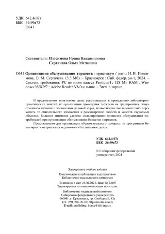 Библиографическое описание: Организация обслуживания торжеств : практикум / Сибирский федеральный университет, Институт торговли и сферы услуг ; сост.: И. В. Изосимова, О. М. Сергачева. - Электрон. текстовые дан. (3,1 Мб). - Красноярск : СФУ, 2024 (2024-06-24). - 106 с. - Загл. с титул. экрана. - Электрон. версия печ. публикации . - Библиогр.: с. 49. - Изд. № 2024-22107 : Б. ц. - Текст : электронный.