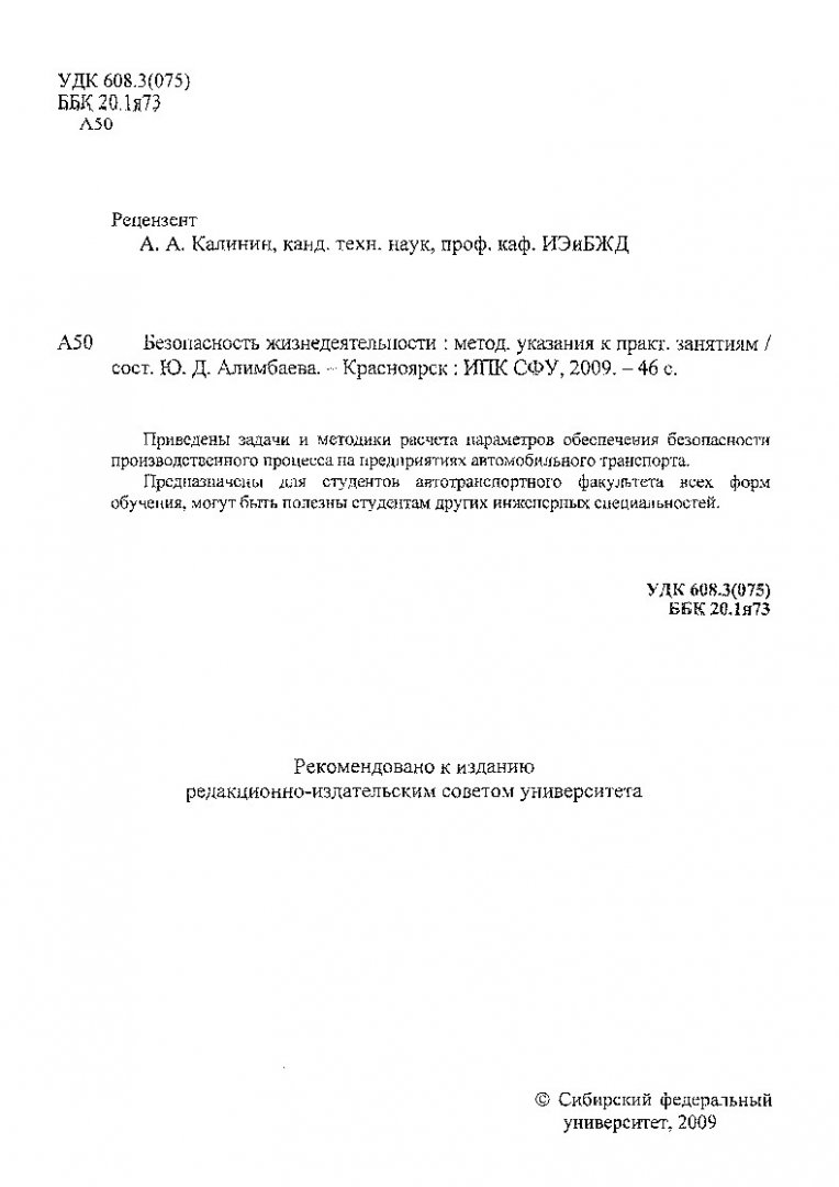Библиографическое описание:Алимбаева, Юлия Джеткизгеновна. Безопасность жизнедеятельности : методические указания к практическим занятиям / Ю. Д. Алимбаева ; Сибирский федеральный университет. - Красноярск : ИПК СФУ, 2009. - 45 с. - Библиогр.: с. 34. - Текст : непосредственный + Текст : электронный.