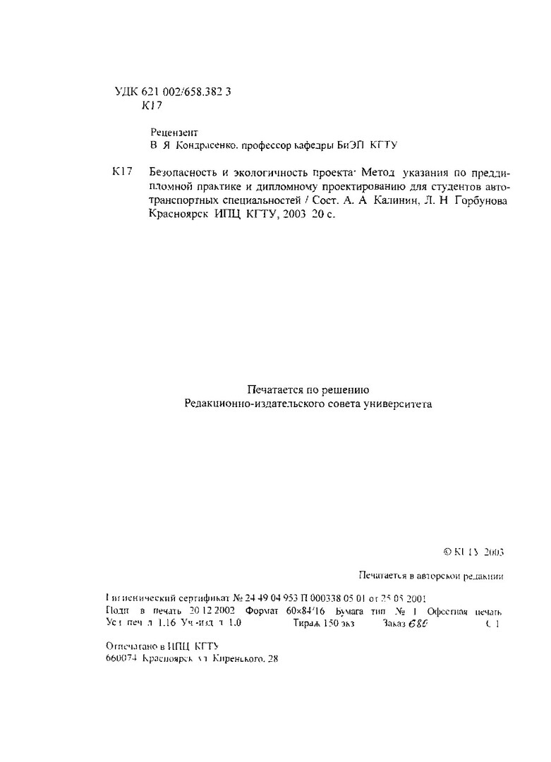 Библиографическое описание:Калинин, Анатолий Александрович. Безопасность и экологичность проекта : метод. указ. по преддипломной практике и дипломному проектированию для студентов автотранспортных спец. / А. А. Калинин, Л. Н. Горбунова ; Краснояр. гос. техн. ун-т. - Красноярск : ИПЦ КГТУ, 2003. - 20 с. : табл. - Библиогр.: с. 17-20. - Текст : непосредственный + Текст : электронный.