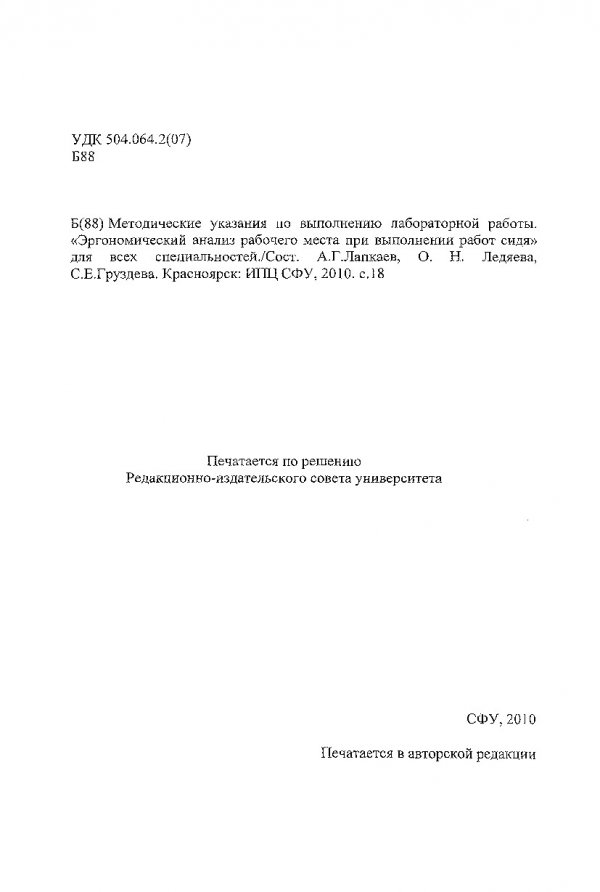 Библиографическое описание:Лапкаев, Алексей Григорьевич. Эргономический анализ рабочего места при выполнении работ сидя : методические указания по выполнению лаб. работы / А. Г. Лапкаев, О. Н. Ледяева, С. Е. Груздева ; Сибирский федеральный университет. - Красноярск : ИПК СФУ, 2010. - 18 с. : ил. - Загл. с титул. экрана. - Текст : непосредственный + Текст : электронный.