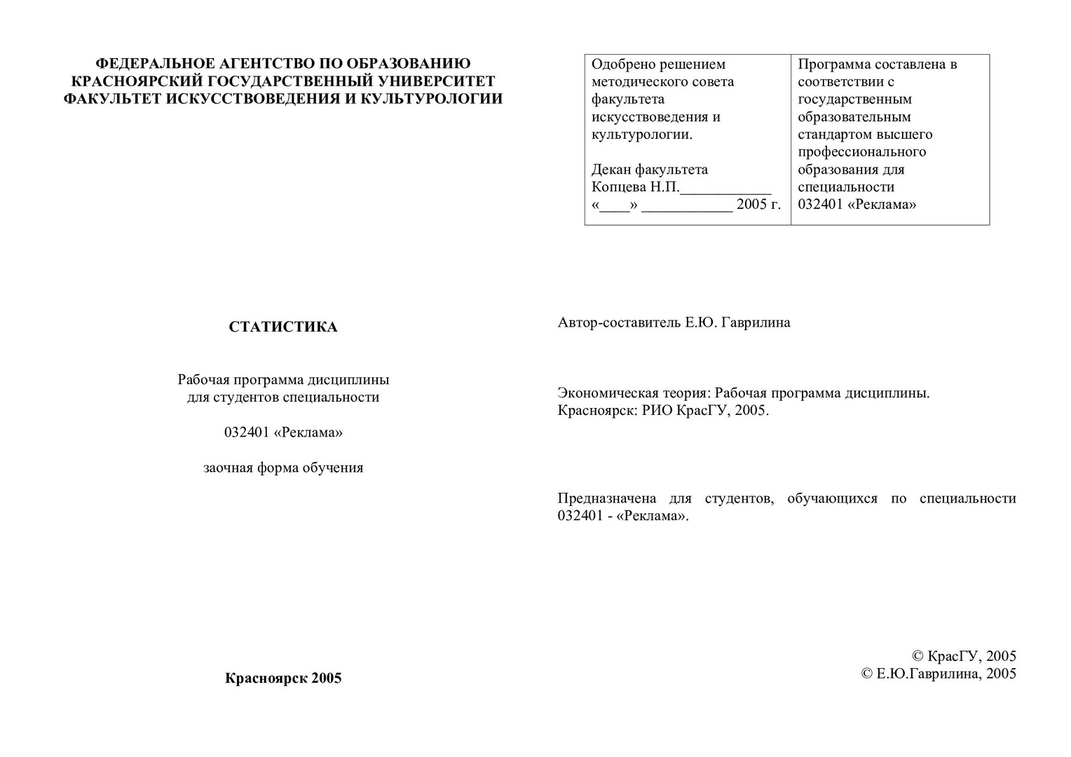 Библиографическое описание:Статистика : рабочая программа для специальности 032401 "Реклама" (заочная форма обучения) / Красноярский университет [КрасГУ] ; сост. Е. Ю. Гаврилина. - Красноярск : РИО КрасГУ, 2005. - Б. ц. - Текст : электронный. Электронная версия печатного издания. Формат: PDF (Adobe Acrobat Reader); Размер: 190Кб; Доступ: свободный
