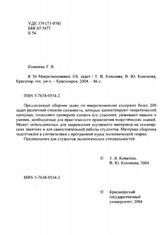 Библиографическое описание:Ковалева, Татьяна Владимировна. Макроэкономика : сборник задач по курсу "Макроэкономика" для студентов экономических специальностей / Т. В. Ковалева, В. Ю. Кононова ; Красноярский университет [КрасГУ]. Экономический факультет. - Красноярск : Красноярский университет [КрасГУ], 2004. - 85 с. - ISBN 5-7638-0554-2. - Текст : непосредственный + Текст : электронный.