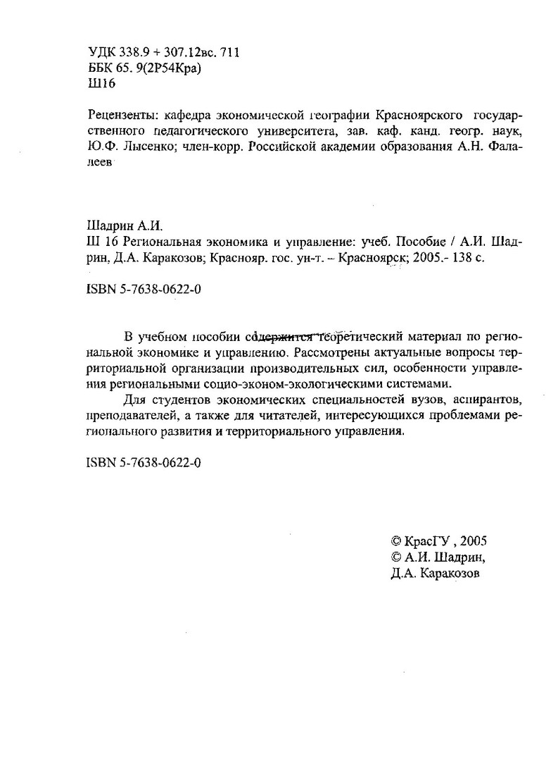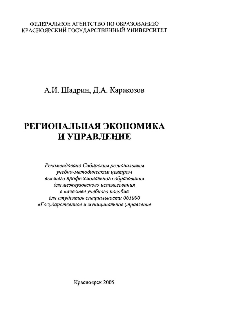Библиографическое описание:Шадрин, Александр Иванович. Региональная экономика и управление : учебное пособие для студентов специальности 061000 "Государственное и муниципальное управление" / А. И. Шадрин, Д. А. Каракозов ; Краснояр. гос. ун-т. Эконом. фак. - Красноярск : Красноярский университет [КрасГУ], 2005. - 137 с. - Список лит.: с.136-137. - Текст : непосредственный + Текст : электронный. Имеется электронная версия печатного издания. Формат: PDF (Adobe Acrobat Reader); Размер: 6.6Мб; Доступ: локальная сеть НБ СФУ
