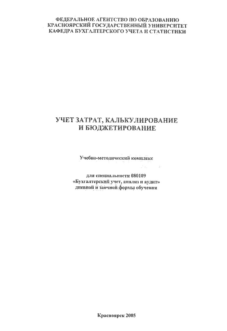 Учет затрат, калькулирование и бюджетирование : учебно-методический комплекс для специальности 080109 "Бухгалтерский учет, анализ и аудит" дневной и заочной формы обучения