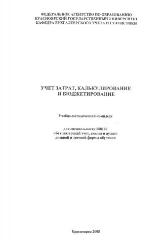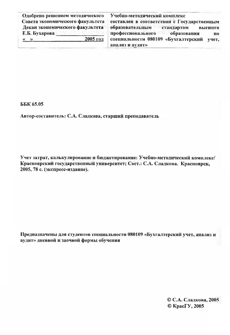 Библиографическое описание:Учет затрат, калькулирование и бюджетирование : учебно-методический комплекс для специальности 080109 "Бухгалтерский учет, анализ и аудит" дневной и заочной формы обучения / Краснояр. гос. ун-т. Эконом. фак. ; сост. С. А. Сладкова. - Красноярск : Красноярский университет [КрасГУ], 2005. - 78 с. : табл. - Текст : непосредственный + Текст : электронный. Режим доступа: читальные залы НБ СФУ