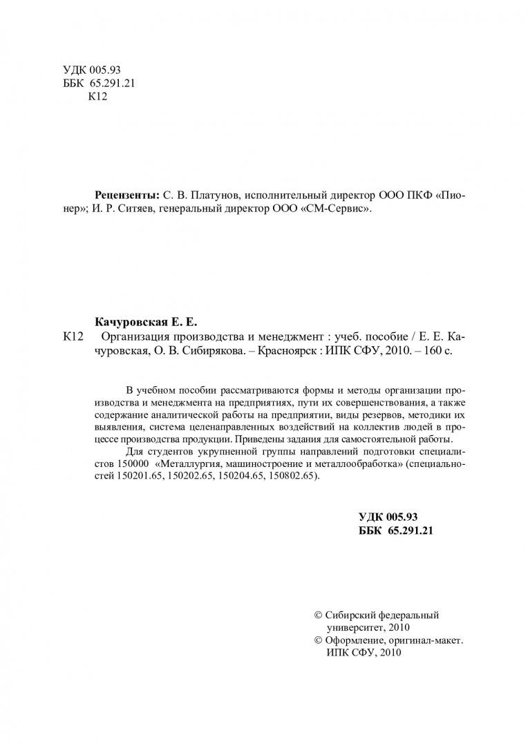 Библиографическое описание:Качуровская, Елена Евгеньевна. Организация производства и менеджмент : учебное пособие / Е. Е. Качуровская, О. В. Сибирякова ; Сибирский федеральный университет. - Электронные данные (PDF ; 1,16 Мб). - Красноярск : ИПК СФУ, 2010. - 159 с. - Загл. с титул. экрана. - Текст : электронный.