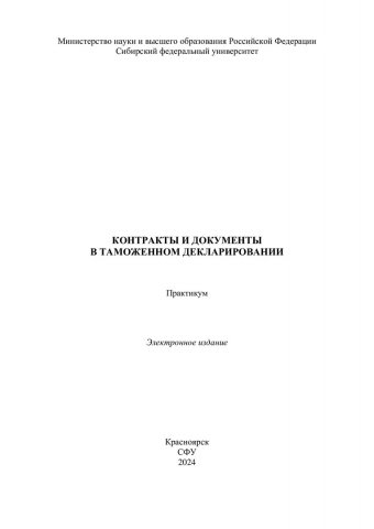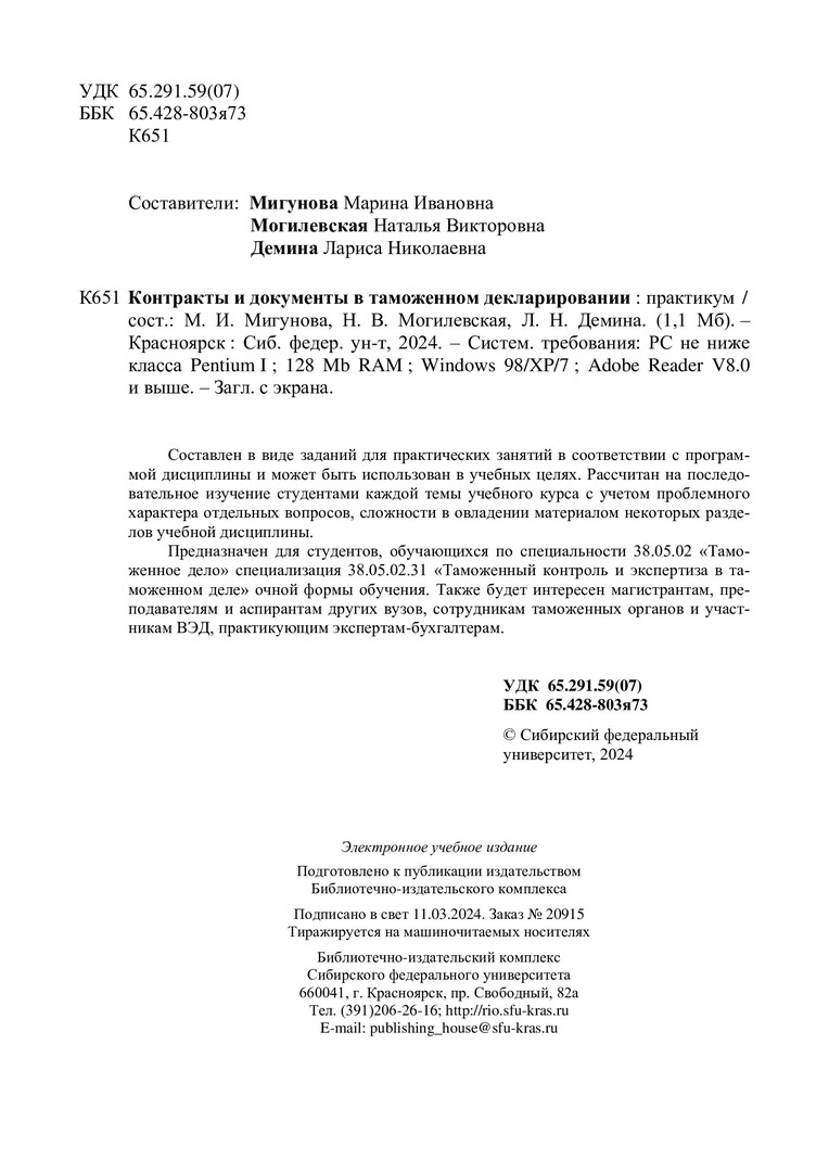 Библиографическое описание: Контакты и документы в таможенном декларировании : практикум / Сиб. федер. ун-т, Ин-т торговли и сферы услуг ; сост.: М. И. Мигунова, Н. В. Могилевская, Л. Н. Демина. - Электрон. текстовые дан. (pdf, 1,3 Мб). - Красноярск : СФУ, 2024 (2024-03-11). - 92 с. - Загл. с титул. экрана. - Изд. № 2024-20915 : Б. ц. - Текст : электронный.