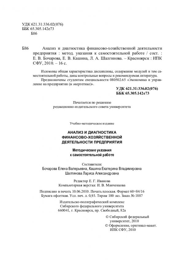 Библиографическое описание:Анализ и диагностика финансово-хозяйственной деятельности предприятия : методические указания к самостоятельной работе / Л. А. Шалгинова ; сост.: Е. В. Бочарова, Е. В. Кашина ; Сибирский федеральный университет [СФУ]. - Электронные данные (PDF ; 0,3 Мб). - Красноярск : ИПК СФУ, 2010. - Загл. с титул. экрана. - Б. ц. - Текст : электронный. Режим доступа: читальные залы НБ СФУ