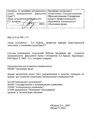 Библиографическое описание:Системы современных технологий : рабочая программа дисциплины для специальности 060200 "Экономика труда" / Краснояр. гос. ун-т ; авт.-сост. Л. А. Красов. - Электрон. текстовые дан. (0,4 Мб). - Красноярск : КрасГУ, 2004. - 13 с. - Загл. с титул. экрана. - Электрон. версия печ. публикации . - Б. ц. - Текст : электронный.