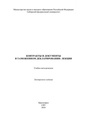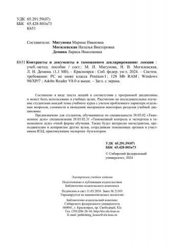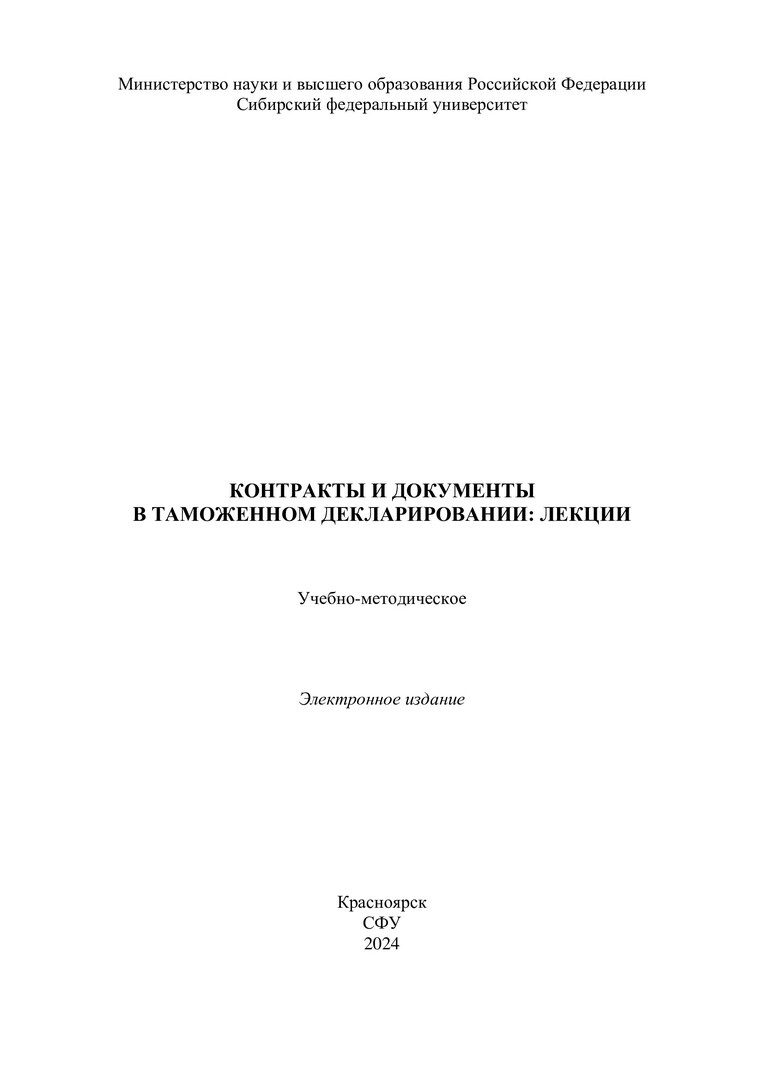 Библиографическое описание: Контакты и документы в таможенном декларировании: лекции : учебно-методическое пособие / Сиб. федер. ун-т, Ин-т торговли и сферы услуг ; сост.: М. И. Мигунова, Н. В. Могилевская, Л. Н. Демина. - Электрон. текстовые дан. (pdf, 1,3 Мб). - Красноярск : СФУ, 2024 (2024-03-11). - 84 с. - Загл. с титул. экрана. - Изд. № 2024-21101 : Б. ц. - Текст : электронный.