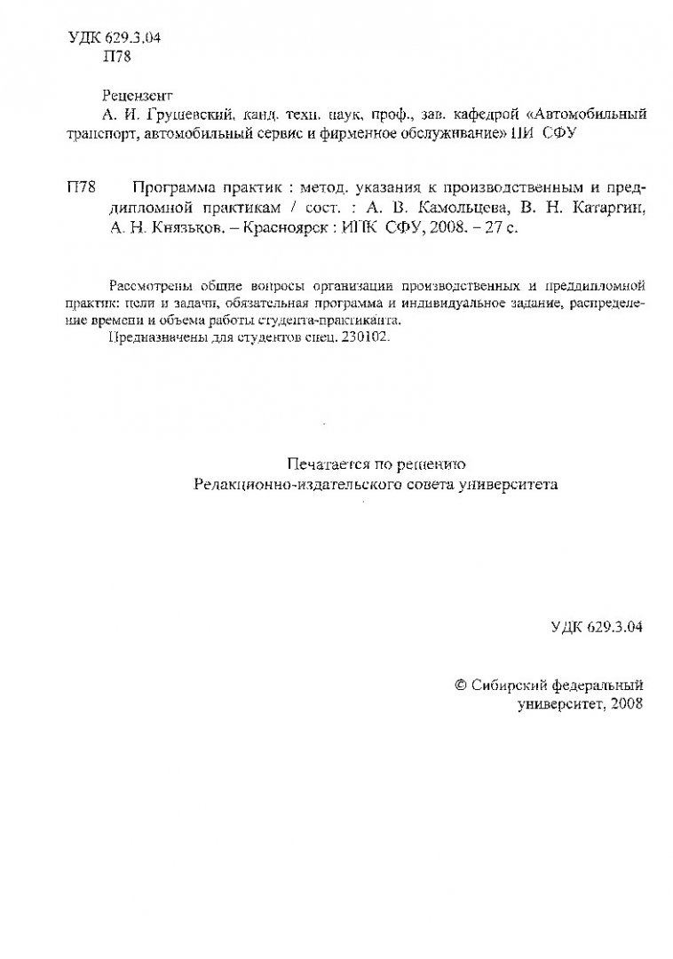 Библиографическое описание:Программа практик : метод указ. к производственной и преддипломной практикам / Сиб. федер. ун-т ; А. В. Камольцева, В. Н. Катаргин, А. Н. Князьков. - Красноярск : ИПК СФУ, 2008. - 27 с. - Загл. с титул. экрана. - 100 экз. - Текст : непосредственный + Текст : электронный.