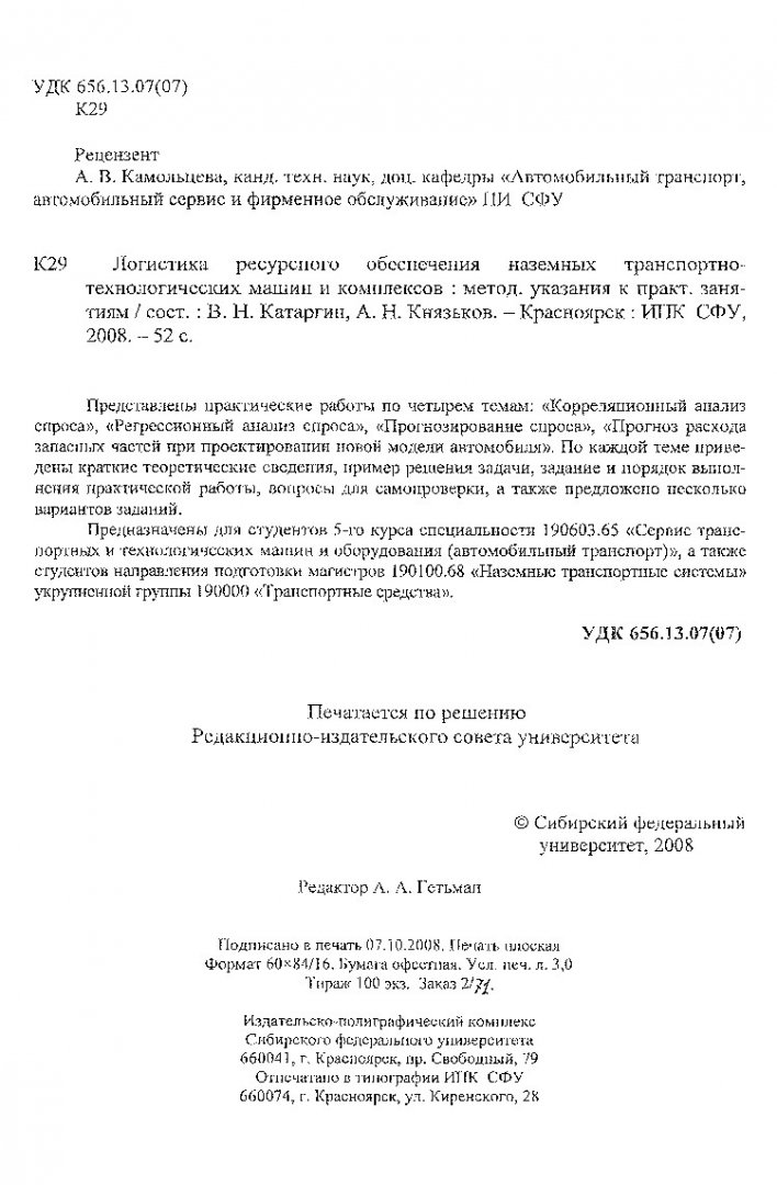 Библиографическое описание:Катаргин, Владимир Николаевич. Логистика ресурсного обеспечения наземных транспортно-технологических машин и комплексов : метод. указ. к практ. занятиям / Сиб. федер. ун-т ; сост.: В. Н. Катаргин, А. Н. Князьков. - Красноярск : ИПК СФУ, 2008. - 52 с. - Загл. с титул. экрана. - 100 экз. - 30.00 р. - Текст : непосредственный + Текст : электронный.