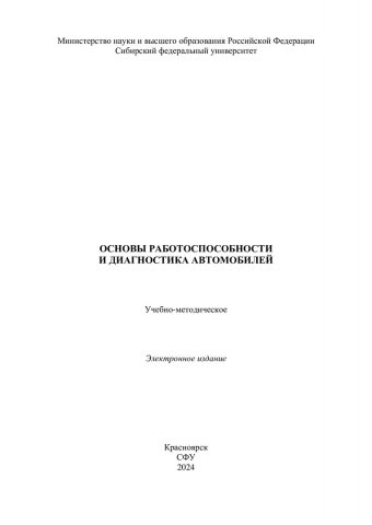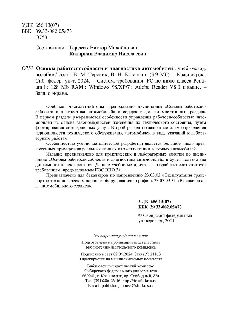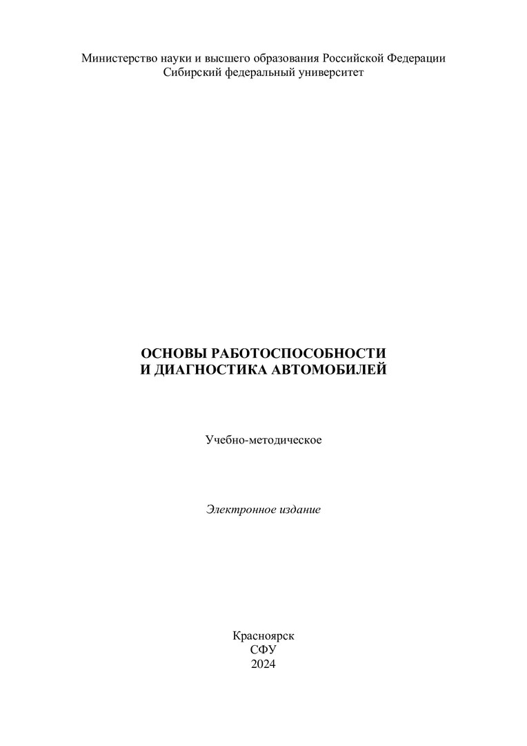 Библиографическое описание: Основы работоспособности и диагностика автомобилей : учебно-методическое пособие / Сиб. федер. ун-т, Политехн. ин-т ; сост.: В. М. Терских, В. Н. Катаргин. - Электрон. текстовые дан. (pdf, 4 Мб). - Красноярск : СФУ, 2024 (2024-04-02). - 63 с. - Загл. с титул. экрана. - Изд. № 2024-21163 : Б. ц. - Текст : электронный.