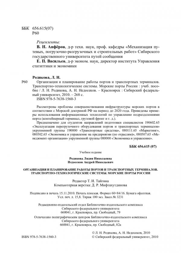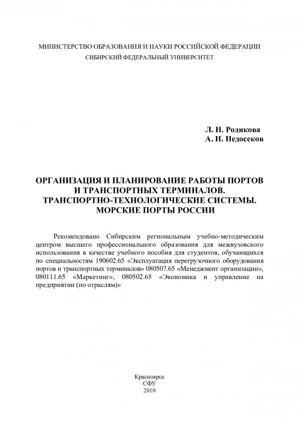 Библиографическое описание: Родикова, Лидия Николаевна. Организация и планирование работы портов и транспортных терминалов. Транспортно-технологические системы. Морские порты России : учеб. пособие / Л. Н. Родикова, А. Н. Недосеков ; Сиб. федерал. ун-т. - Красноярск : ИПК СФУ, 2010. - 268 с. : ил. - Библиогр.: с. 251-252. - 100 экз. - ISBN 978-5-7638-1560-3. - Текст : непосредственный + Текст : электронный.