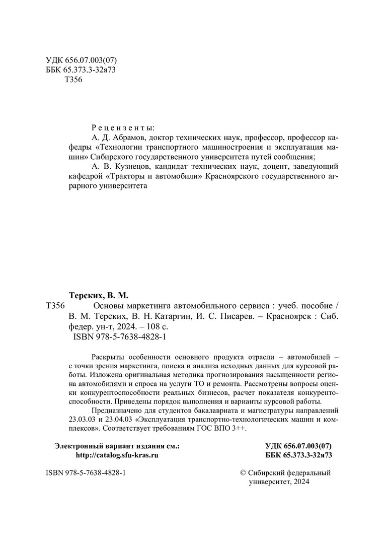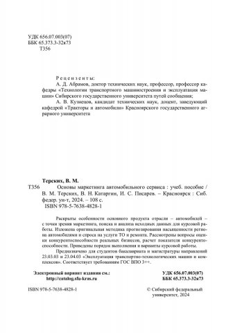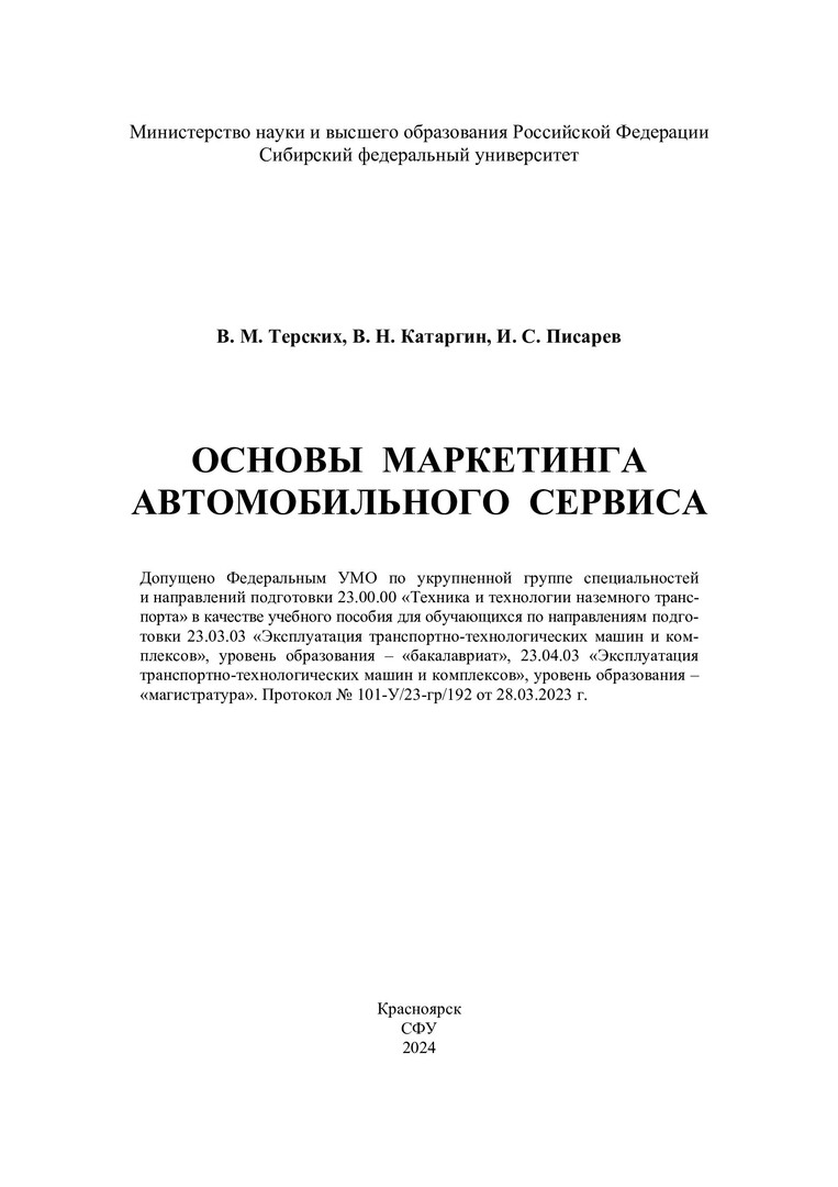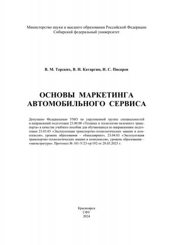 Библиографическое описание:Терских, Виктор Михайлович. Основы маркетинга автомобильного сервиса : учебное пособие для обучающихся по направлениям подготовки 23.03.03 «Эксплуатация транспортно-технологических машин и комплексов», уровень образования – «бакалавриат», 23.04.03 «Эксплуатация транспортно-технологических машин и комплексов», уровень образования - «магистратура» / В. М. Терских, В. Н. Катаргин, И. С. Писарев ; рец.: А. Д. Абрамов, А. В. Кузнецов ; Сибирский федеральный университет, Политехнический институт. - Электрон. текстовые дан. (4,9 Мб). - Красноярск : СФУ, 2024 (2024-02-20). - 108 с., 6.8 усл. печ. л. : граф., цв. ил., табл. - Загл. с титул. экрана. - Электрон. версия печ. публикации . - Библиогр.: с. 103. - 300 экз. - ISBN 978-5-7638-4828-1 : Б. ц. - Изд. № 2023-18651. - Текст : электронный.