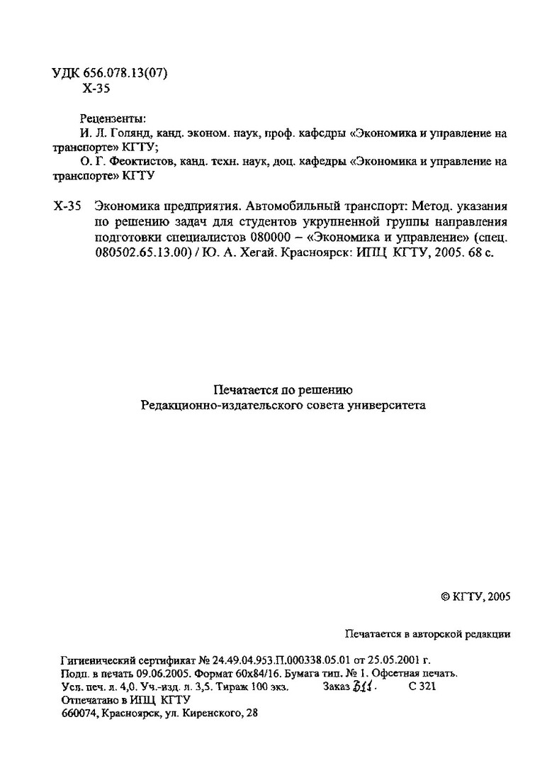 Библиографическое описание:Хегай, Юрий Александрович. Экономика предприятия. Автомобильный транспорт : метод. указ. по решению задач для студентов укрупнен. группы направления подгот. спец. 080000- "Экономика и управление" (спец. 080502.65.13.00) / Ю. А. Хегай ; Краснояр. гос. техн. ун-т. - Красноярск : ИПЦ КГТУ, 2005. - 68 с. - Текст : непосредственный + Текст : электронный.