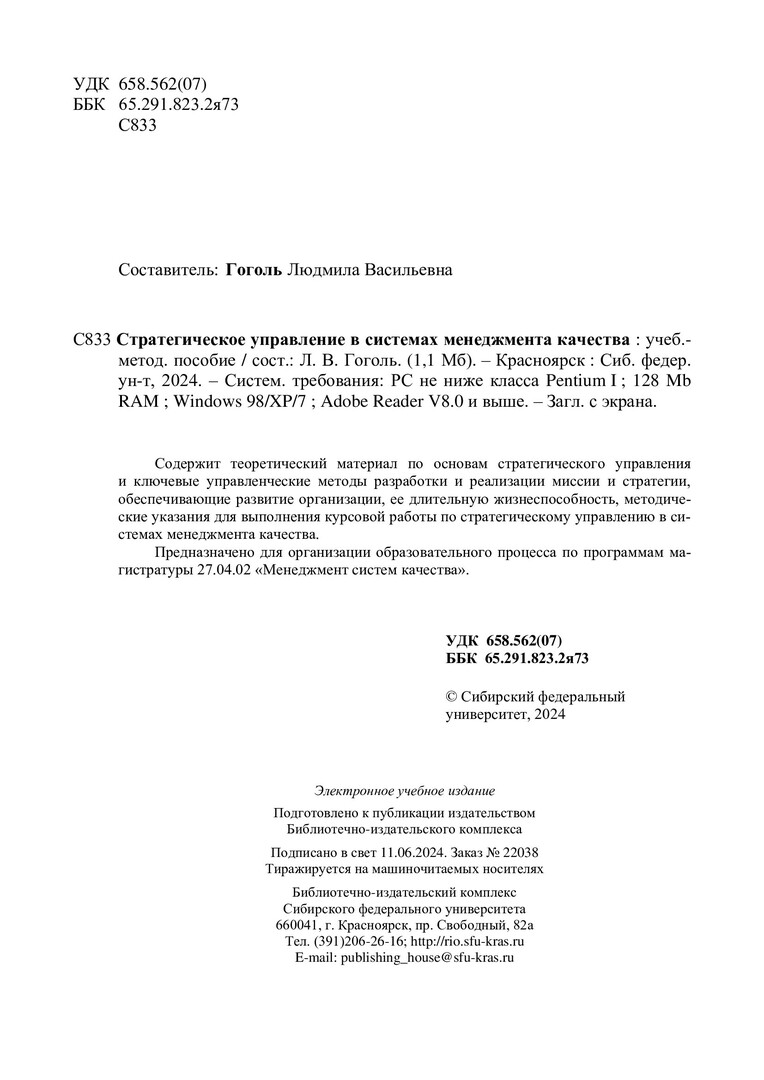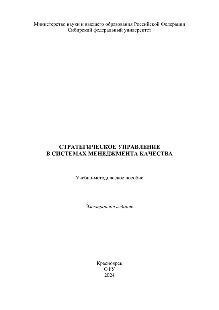 Библиографическое описание:Стратегическое управление в системах менеджмента качества : учебно-методическое пособие / Сиб. федер. ун-т, Политехн. ин-т ; сост. Л. В. Гоголь. - Электрон. текстовые дан. (pdf, 1,2 Мб). - Красноярск : СФУ, 2024 (2024-06-11). - 40 с. - Загл. с титул. экрана. - Изд. № 2024-22038 : Б. ц. - Текст : электронный.
