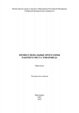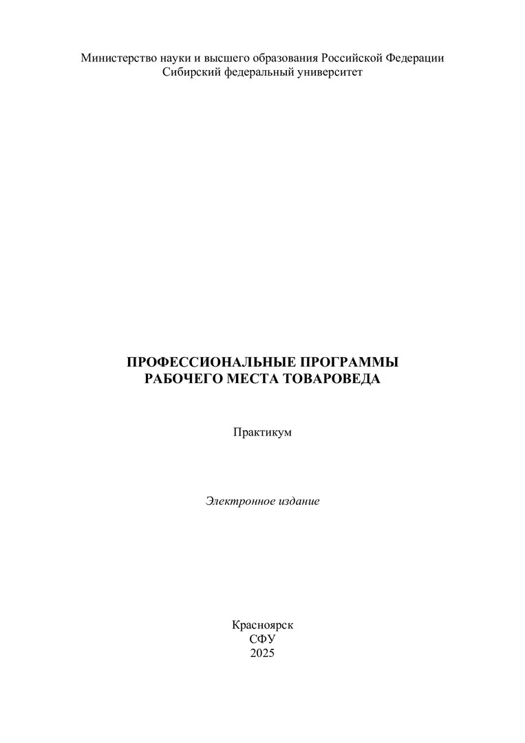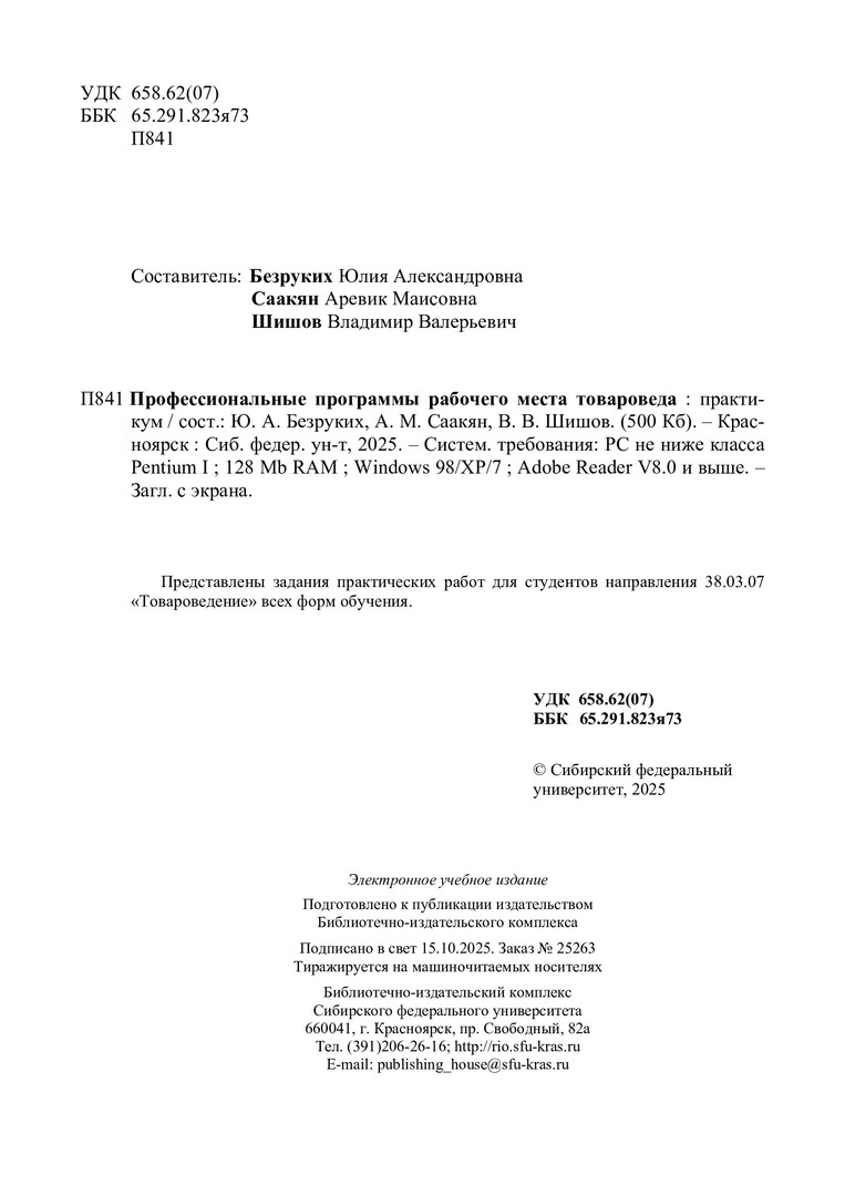 Библиографическое описание:Профессиональные программы рабочего места товароведа : практикум / Сибирский федеральный университет, Институт торговли и сферы услуг ; сост.: Ю. А. Безруких, А. М. Саакян, В. В. Шишов. - Электрон. текстовые дан. (pdf, 2.5 Мб). - Красноярск : СФУ, 2025 (2025-10-15). - 43 с. - Загл. с титул. экрана. - Библиогр.: с. 43. - Изд. № 2025-25263 : Б. ц. - Текст : электронный.