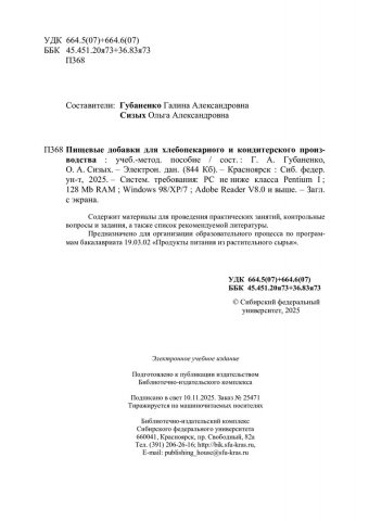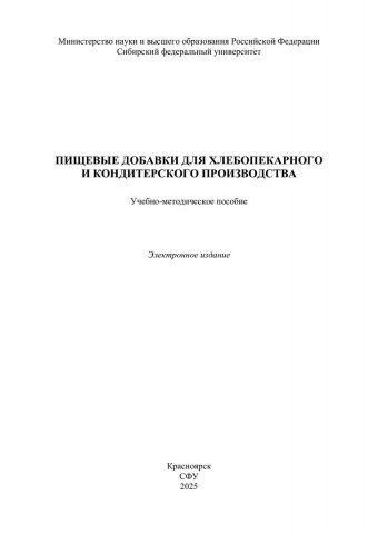 Библиографическое описание:Пищевые добавки для хлебопекарного и кондитерского производства : [лабораторные работы] : учебно-методическое пособие / Сибирский федеральный университет, Институт торговли и сферы услуг ; сост.: Г. А. Губаненко, О. А. Сизых. - Электрон. текстовые дан. (pdf, 0.9 Мб). - Красноярск : СФУ, 2025 (2025-11-10). - 83 с. - Загл. с титул. экрана. - Библиогр.: с. 75-78. - Изд. № 2025-25471 : Б. ц. - Текст : электронный.