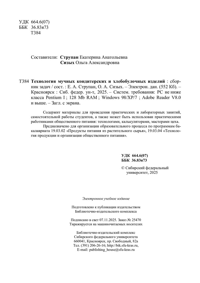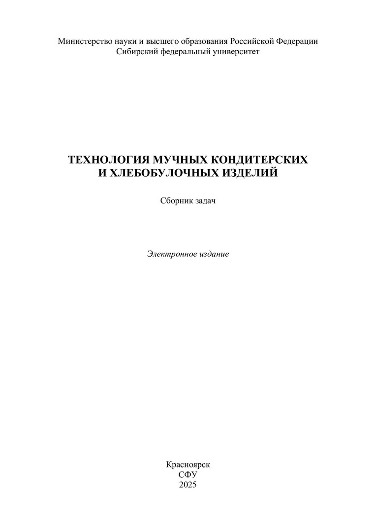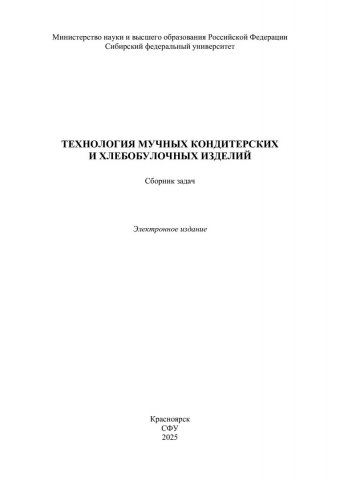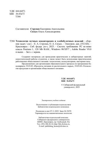 Библиографическое описание: Технология мучных кондитерских и хлебобулочных изделий : сборник задач / Сибирский федеральный университет, Институт торговли и сферы услуг ; сост.: Е. А. Струпан, О. А. Сизых. - Электрон. текстовые дан. (pdf, 0.6 Мб). - Красноярск : СФУ, 2025 (2025-11-07). - 45 с. : табл. - Загл. с титул. экрана. - Библиогр.: с. 44-45. - Изд. № 2025-25470 : Б. ц. - Текст : электронный.