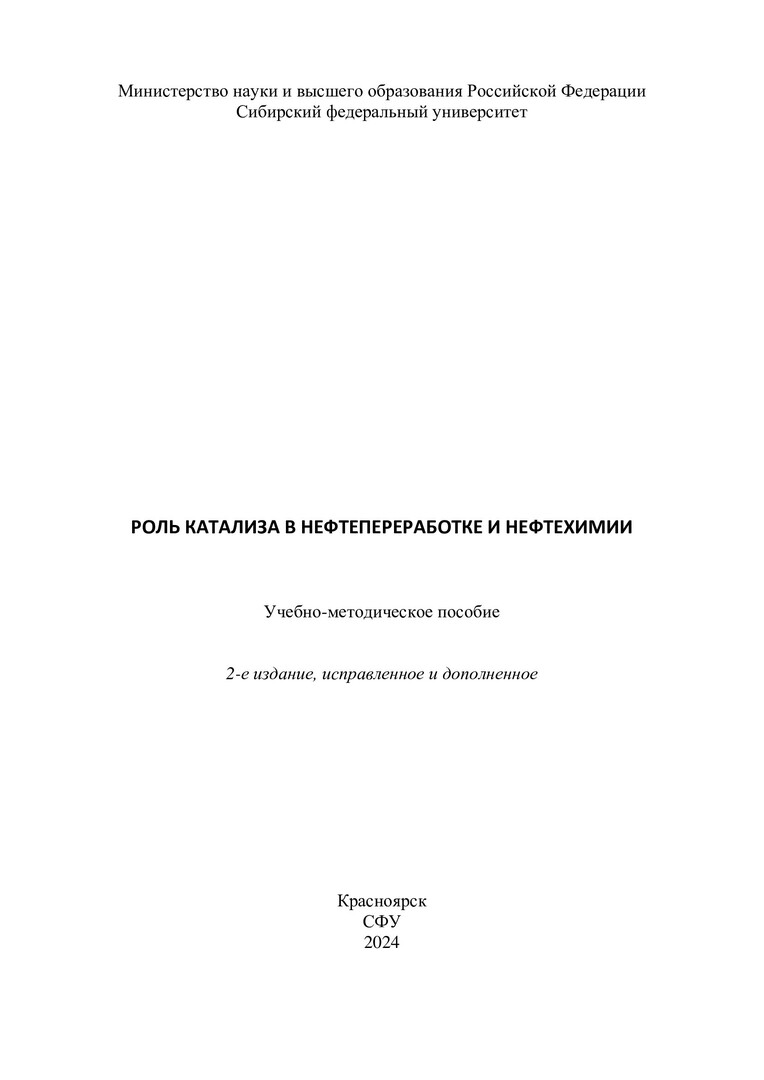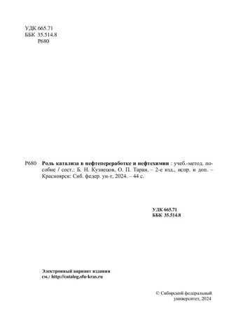 Библиографическое описание:Роль катализа в нефтепереработке и нефтехимии : учебно-методическое пособие / Сибирский федеральный университет ; сост.: Б. Н. Кузнецов, О. П. Таран. - 2-е изд., испр. и доп. - Электрон. текстовые дан. (1,8 Мб). - Красноярск : СФУ, 2024. - 44 с. : схемы. - Загл. с титул. экрана. - Электрон. версия печ. публикации . - Библиогр.: с. 41. - 100 экз. - Изд. № 2024-22396 : Б. ц. - Текст : электронный.