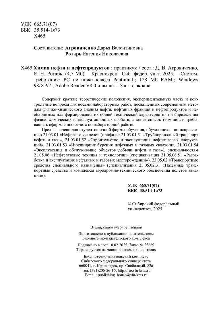 Библиографическое описание: Химия нефти и нефтепродуктов : практикум / Сибирский федеральный университет, Институт нефти и газа ; сост.: Д. В. Агровиченко, Е. Н. Ротарь. - Электрон. текстовые дан. (pdf, 6,2 Мб). - Красноярск : СФУ, 2025 (2025-02-10). - 75 с. - Загл. с титул. экрана. - Библиогр.: с. 70. - Изд. № 2025-23689 : Б. ц. - Текст : электронный.