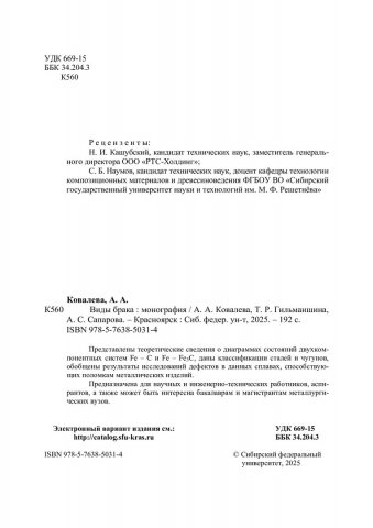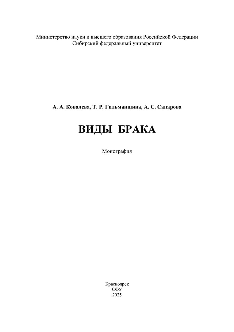 Библиографическое описание: Ковалева, Ангелина Адольфовна. Виды брака : монография / А. А. Ковалева, Т. Р. Гильманшина, А. С. Сапарова ; рец.: Н. И. Кашубский, С. Б. Наумов ; Сибирский федеральный университет, Институт цветных металлов. - Электрон. текстовые дан. (pdf ; 77,4 Мб). - Красноярск : СФУ, 2025 (2025-06-04). - 192 с., 12.0 усл. печ. л. : ил., цв. ил., табл. - Загл. с титул. экрана. - Электрон. версия печ. публикации . - Библиогр.: с. 156-161. - 500 экз. - ISBN 978-5-7638-5031-4 : Б. ц. - Изд. № 2024-22391. - Текст : электронный.