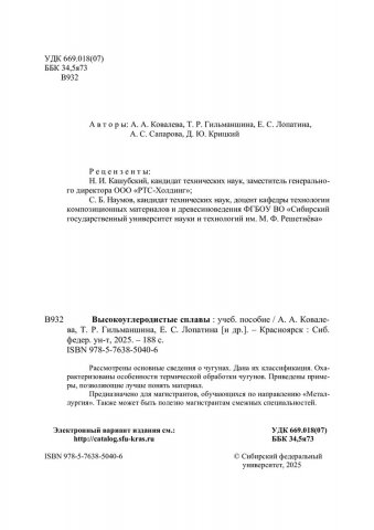 Библиографическое описание: Высокоуглеродистые сплавы : учебное пособие / А. А. Ковалева, Т. Р. Гильманшина, Е. С. Лопатина [и др.] ; рец.: Н. И. Кашубский, С. Б. Наумов ; Сибирский федеральный университет, Институт цветных металлов. - Электрон. текстовые дан. (pdf ; 24,0 Мб). - Красноярск : СФУ, 2025 (2025-04-21). - 188 с., 11.5 усл. печ. л. : ил., цв. ил., табл., схемы. - Загл. с титул. экрана. - Электрон. версия печ. публикации . - Библиогр.: с. 152-162. - 100 экз. - ISBN 978-5-7638-5040-6 : Б. ц. - Изд. № 2024-22603. - Текст : электронный.