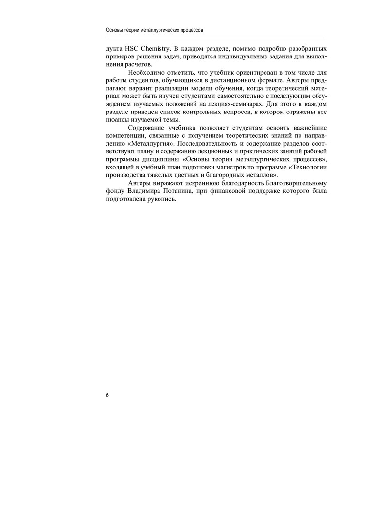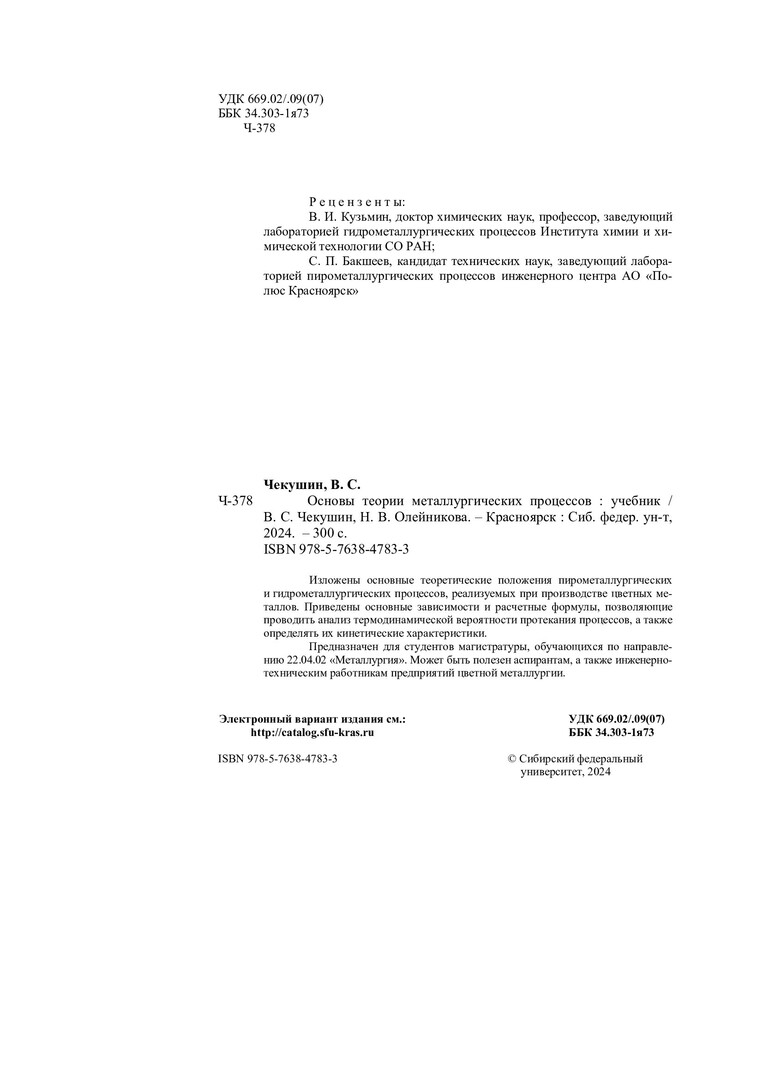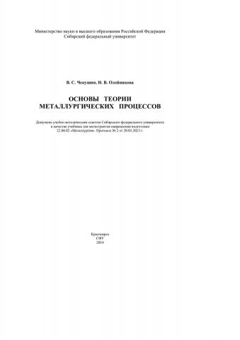 Библиографическое описание: Чекушин, Владимир Семенович. Основы теории металлургических процессов : учебник для магистрантов направления подготовки 22.04.02 «Металлургия» / В. С. Чекушин, Н. В. Олейникова ; [рец.: В. И. Кузьмин, С. П. Бакшеев] ; Сибирский федеральный университет, Институт цветных металлов. - Красноярск : СФУ, 2024 (2024-06-20). - 298 с., 24.5 усл. печ. л. : цв. ил., схемы, табл. - (Учебник Сибирского федерального университета). - Библиогр.: с. 297-298. - 500 экз. - ISBN 978-5-7638-4783-3 (в пер.) : 555.00 р. - Изд. № 2022-17894. - Текст : электронный + Текст : непосредственный.