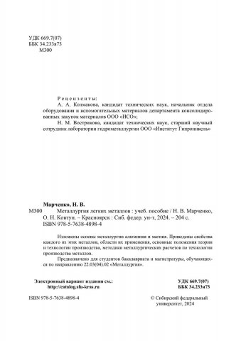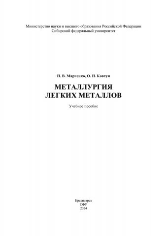 Библиографическое описание: Марченко, Наталья Владимировна. Металлургия легких металлов : учебное пособие / Н. В. Марченко, О. Н. Ковтун ; рец.: А. А. Колмакова, Н. М. Вострикова ; Сибирский федеральный университет, Институт цветных металлов. - Электрон. текстовые дан. (10,2 Мб). - Красноярск : СФУ, 2024 (2024-10-24). - 204 с., 12.8 усл. печ. л. : ил., рис., табл. - Загл. с титул. экрана. - Электрон. версия печ. публикации . - Библиогр.: с. 199. - 100 экз. - ISBN 978-5-7638-4898-4 : Б. ц. - Изд. № 2023-20263. - Текст : электронный.