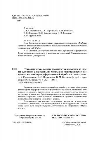 Библиографическое описание: Технологические основы производства проволоки из сплавов алюминия с переходными металлами с применением совмещенных методов термодеформационной обработки : монография / С. Б. Сидельников, Д. С. Ворошилов, В. М. Беспалов [и др.] ; рец.: Н. А. Белов, Р. Л. Шаталов ; Сибирский федеральный университет, Институт цветных металлов. - Электрон. текстовые дан. - Красноярск : СФУ, 2025 (2025-05-28). - 208 с., 13.0 усл. печ. л. : граф., цв. ил., табл. - Загл. с титул. экрана. - Электрон. версия печ. публикации . - Библиогр.: с. 188-204. - 500 экз. - ISBN 978-5-7638-4956-1 : Б. ц. - Изд. № 2024-22193. - Текст : электронный.