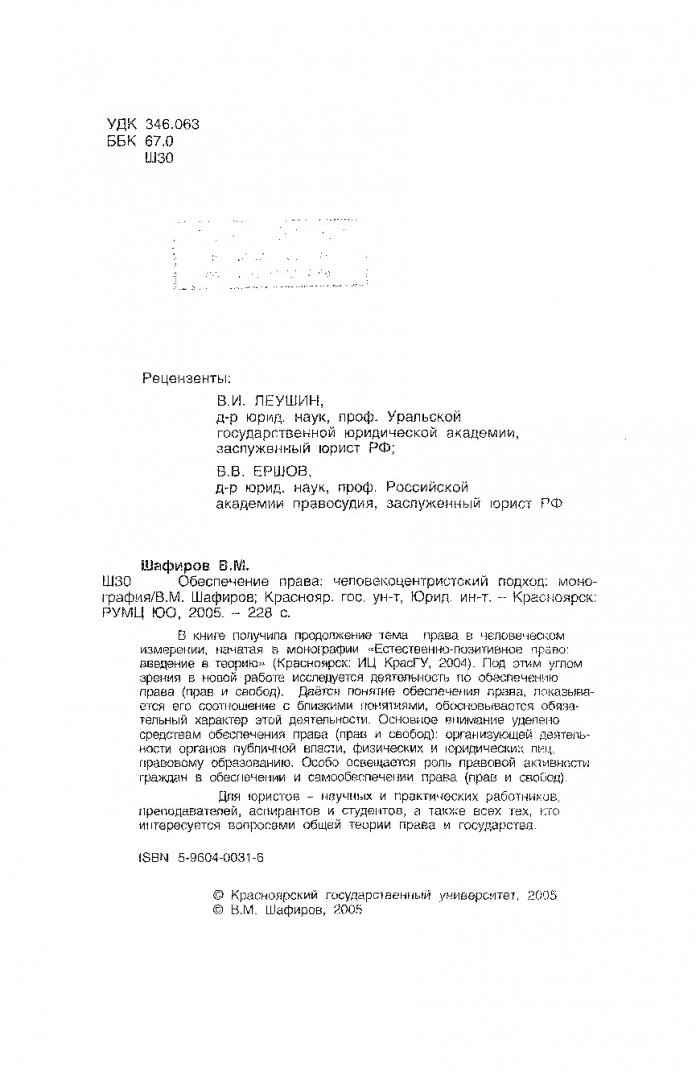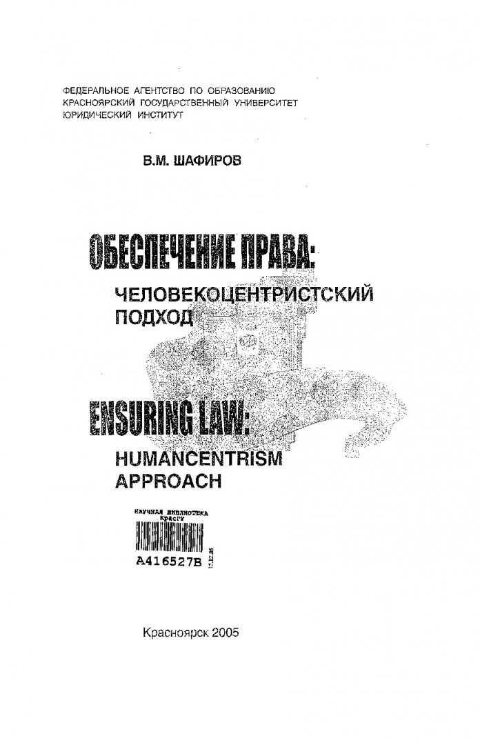 Библиографическое описание:Шафиров, Владимир Моисеевич. Обеспечение права: человекоцентристский подход = Ensuring law: Hymancentrism approach : монография / В. М. Шафиров ; Красноярский университет [КрасГУ]. Юридический институт [ЮИ]. - Красноярск : Красноярский университет [КрасГУ], 2005. - 227 с. - ISBN 5-9604003-1-6. - Текст : непосредственный + Текст : электронный. Режим доступа: читальные залы НБ СФУ