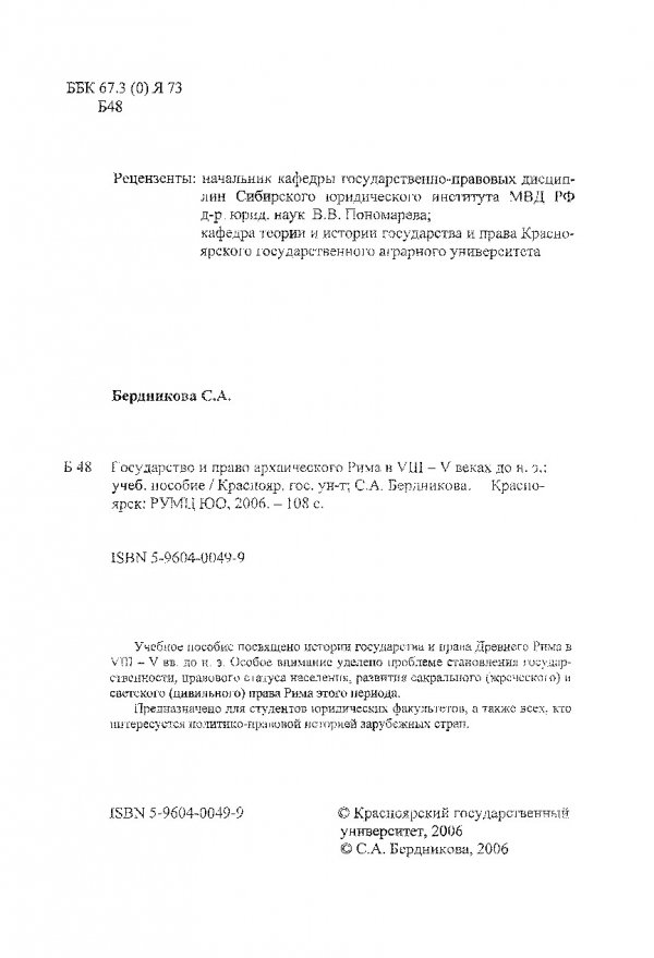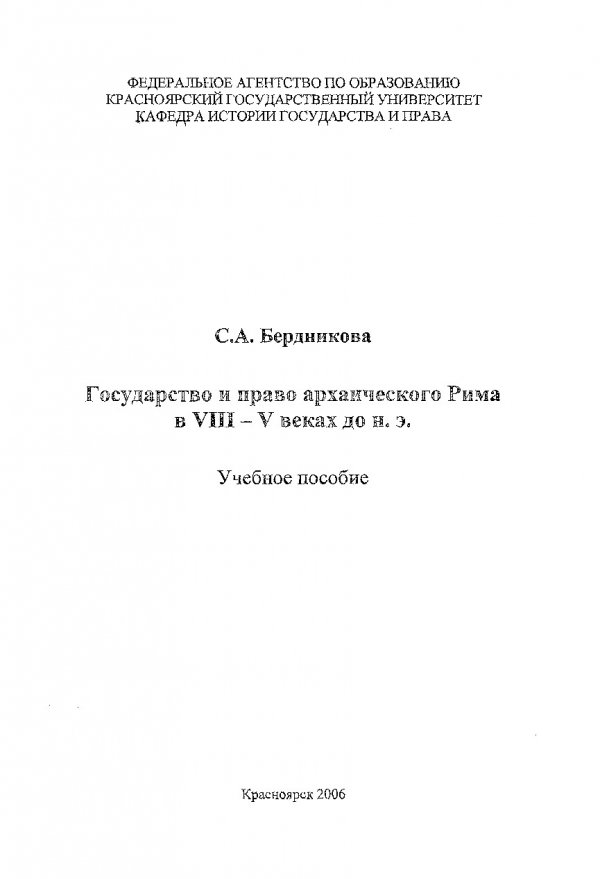 Библиографическое описание:Бердникова, Светлана Александровна. Государство и право архаического Рима в VIII-V веках до н. э. : учебное пособие / С. А. Бердникова ; Красноярский университет [КрасГУ]. Юридический институт [ЮИ]. - Красноярск : Красноярский университет [КрасГУ], 2006. - 107 с. - ISBN 5-9604004-9-9 : 28.50 р. - Текст : непосредственный + Текст : электронный. Режим доступа: читальные залы НБ СФУ