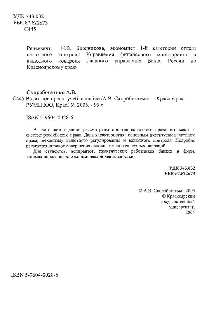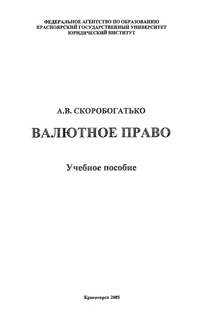 Библиографическое описание:Скоробогатько, Александр Викторович. Валютное право : учебное пособие / А. В. Скоробогатько ; Красноярский университет [КрасГУ]. Юридический институт [ЮИ]. - Красноярск : Красноярский университет [КрасГУ], 2005. - 94 с. - ISBN 5-9604002-8-6 : 44 р. - Текст : непосредственный + Текст : электронный. Режим доступа: читальные залы НБ СФУ