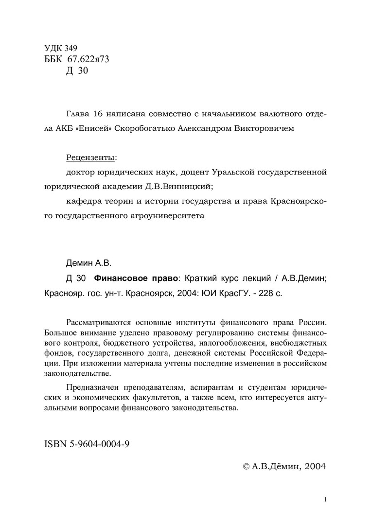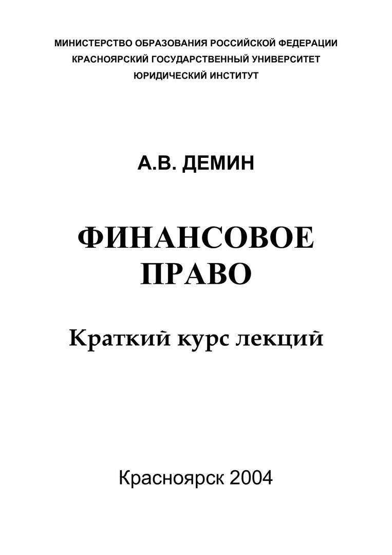 Библиографическое описание:Демин, Александр Васильевич. Финансовое право : краткий курс лекций / А. В. Демин ; Красноярский университет [КрасГУ]. Юридический институт [ЮИ]. - Красноярск : Красноярский университет [КрасГУ], 2004. - 216 с. - ISBN 5-9604000-4-9 : 150.35 р. - Текст : непосредственный + Текст : электронный. Имеется электронная версия печатного издания. Формат: PDF (Adobe Acrobat Reader); Размер: 1.65Мб; Доступ: свободный