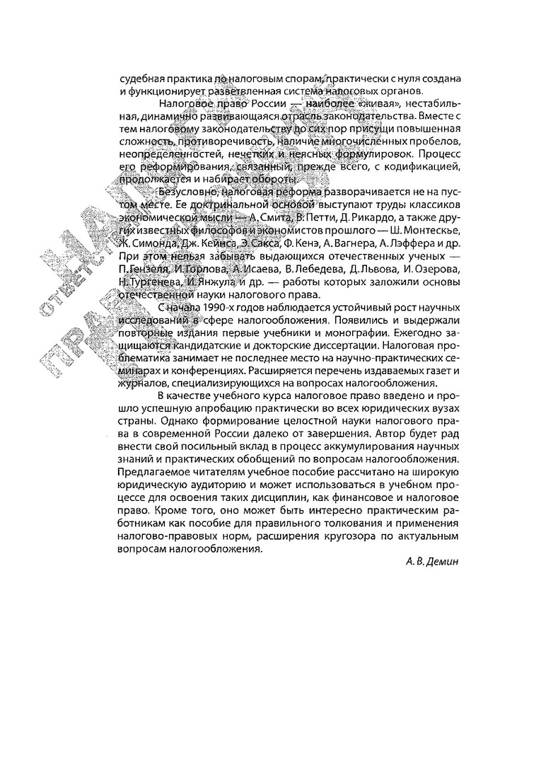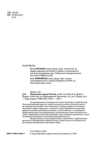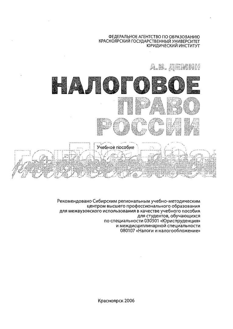 Библиографическое описание:Демин, Александр Васильевич. Налоговое право России : учебное пособие для студентов, обучающихся по специальности 030501 "Юриспруденция" и междисциплинарной специальности 080107 080107 "Налоги и налогообложение" / А. В. Демин ; Красноярский университет [КрасГУ]. Юридический институт [ЮИ]. - Красноярск : Красноярский университет [КрасГУ], 2006. - 463 с. - Список лит.: с.455-463. - ISBN 5-9604002-2-7. - Текст : непосредственный + Текст : электронный. Режим доступа: читальные залы НБ СФУ