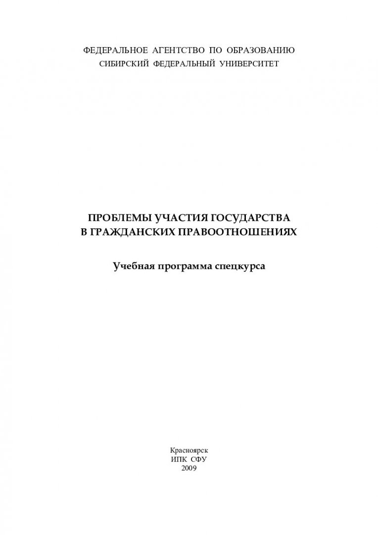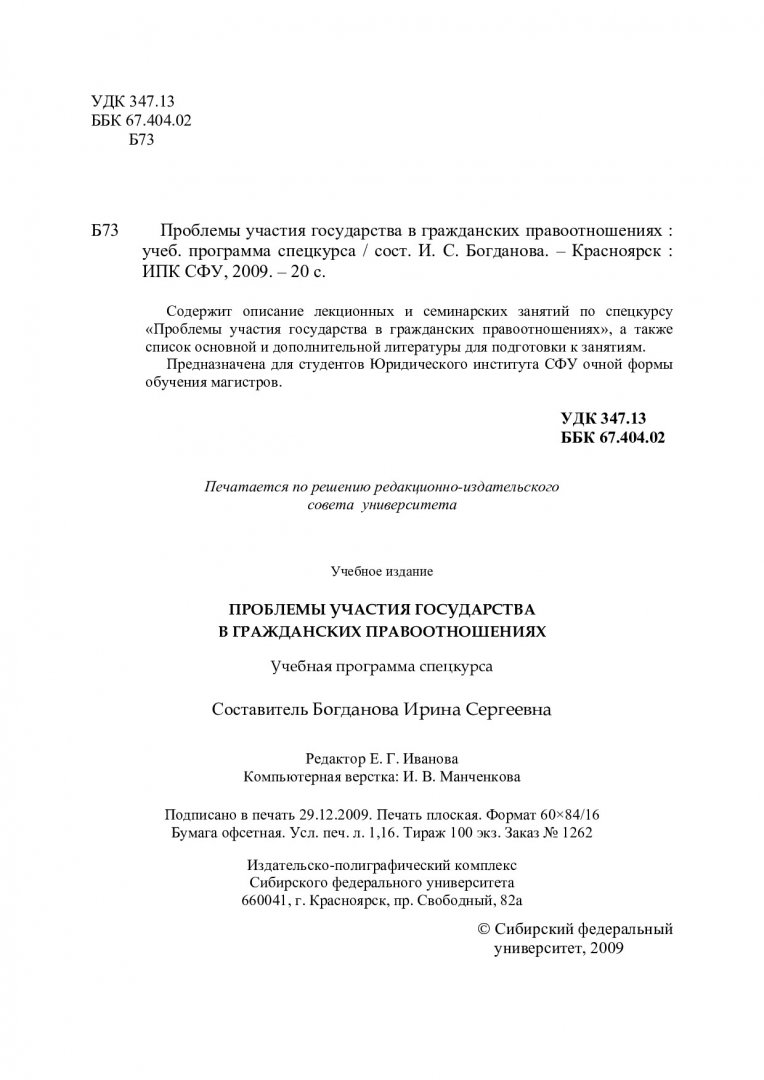 Библиографическое описание:Проблемы участия государства в гражданских правоотношениях : учебная программа спецкурса / Сибирский федеральный университет [СФУ] ; сост. И. С. Богданова. - Красноярск : Информационно-полиграфический комплекс [ИПК] СФУ, 2009. - 20 с. - 9.20 р. - Текст : непосредственный + Текст : электронный. Режим доступа: читальные залы НБ СФУ