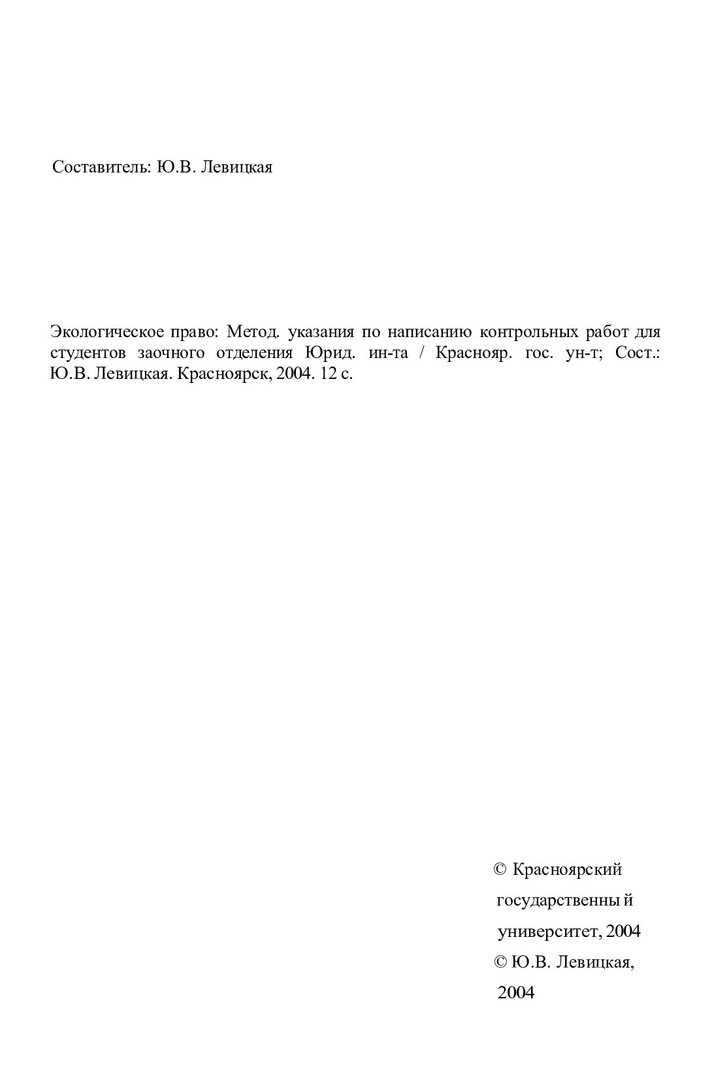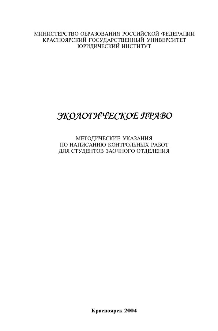 Библиографическое описание:Экологическое право : методические указания по написанию контрольных работ для студентов заочного отделения / Красноярский университет [КрасГУ]. Юридический институт [ЮИ] ; сост. Ю. В. Левицкая. - Красноярск : Красноярский университет [КрасГУ], 2004. - 10 с. - 5.35 р. - Текст : непосредственный + Текст : электронный.