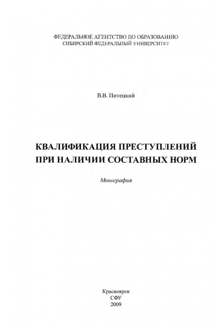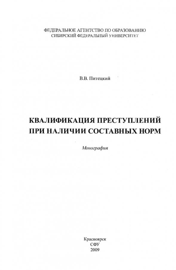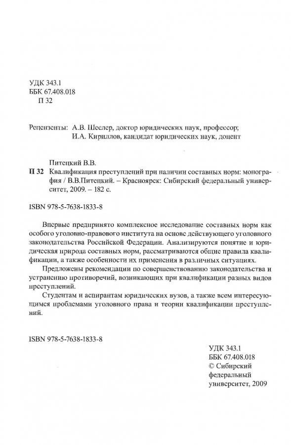 Библиографическое описание:Питецкий, Вадим Валерьевич. Квалификация преступлений при наличии составных норм : монография / В. В. Питецкий ; Сибирский федеральный университет [СФУ]. - Красноярск : Информационно-полиграфический комплекс [ИПК] СФУ, 2009. - 181 с. - ISBN 978-5-7638-1833-8. - Текст : непосредственный + Текст : электронный.