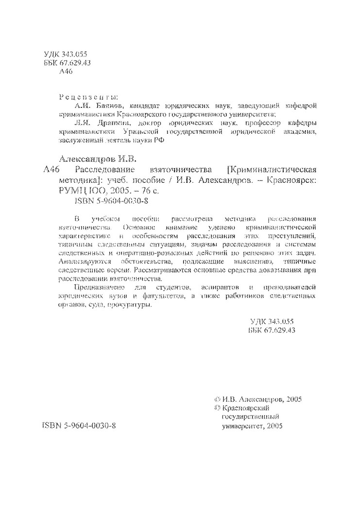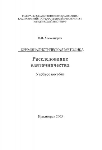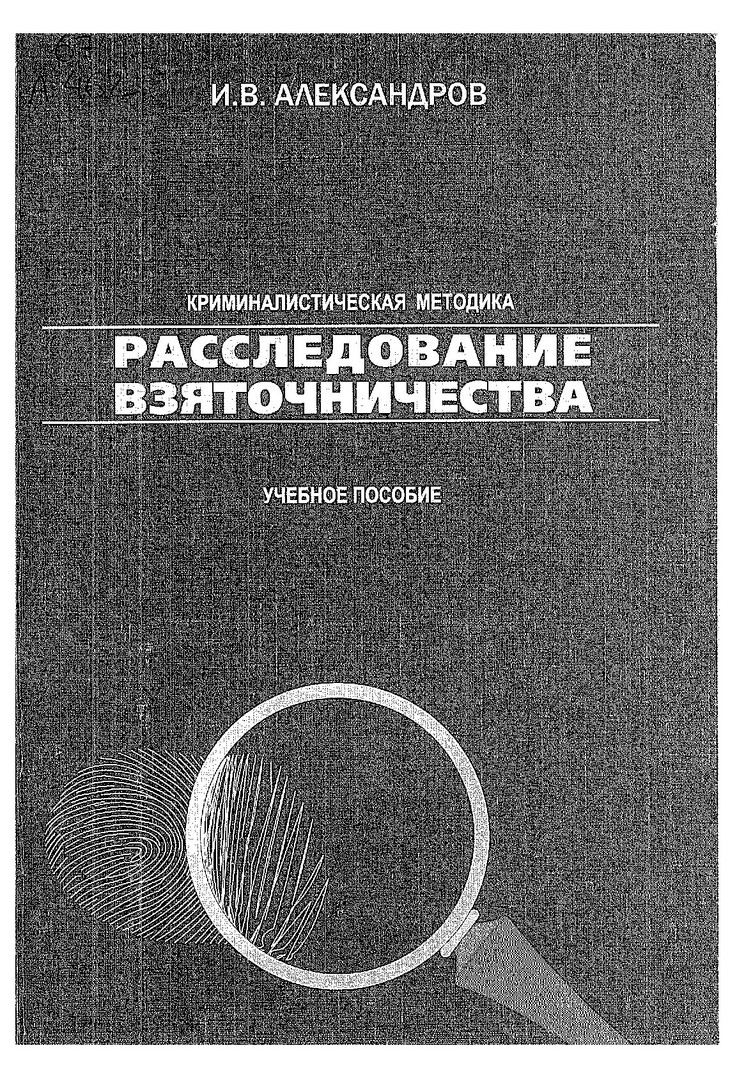 Александров, Игорь Викторович. Расследование взяточниства : учебное пособие / И. В. Александров ; Краснояр. гос. ун-т. - Электрон. текстовые дан.(11,2 Мб). - Красноярск : КГУ, 2005. - 77 с. - (криминалистическая методика). - Загл. с титул. экрана. - Текст : непосредственный + Текст : электронный.