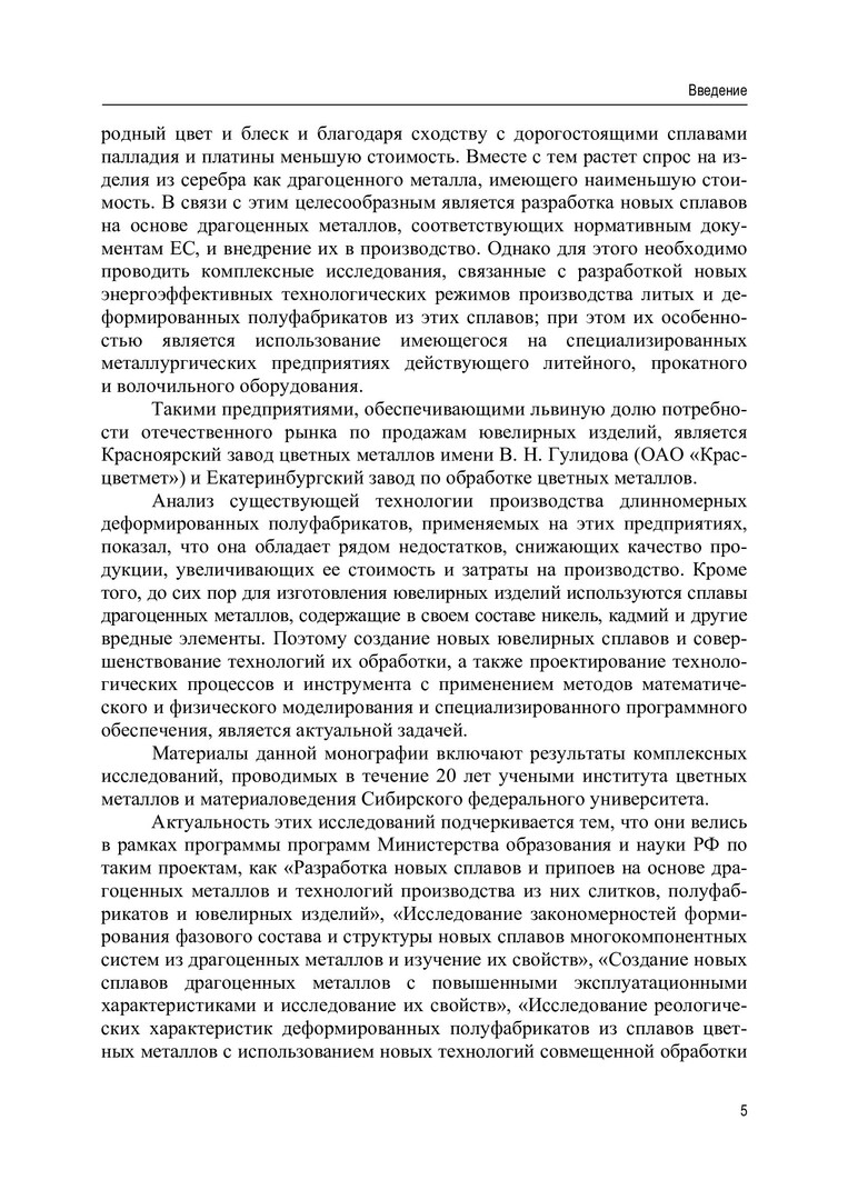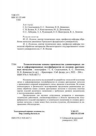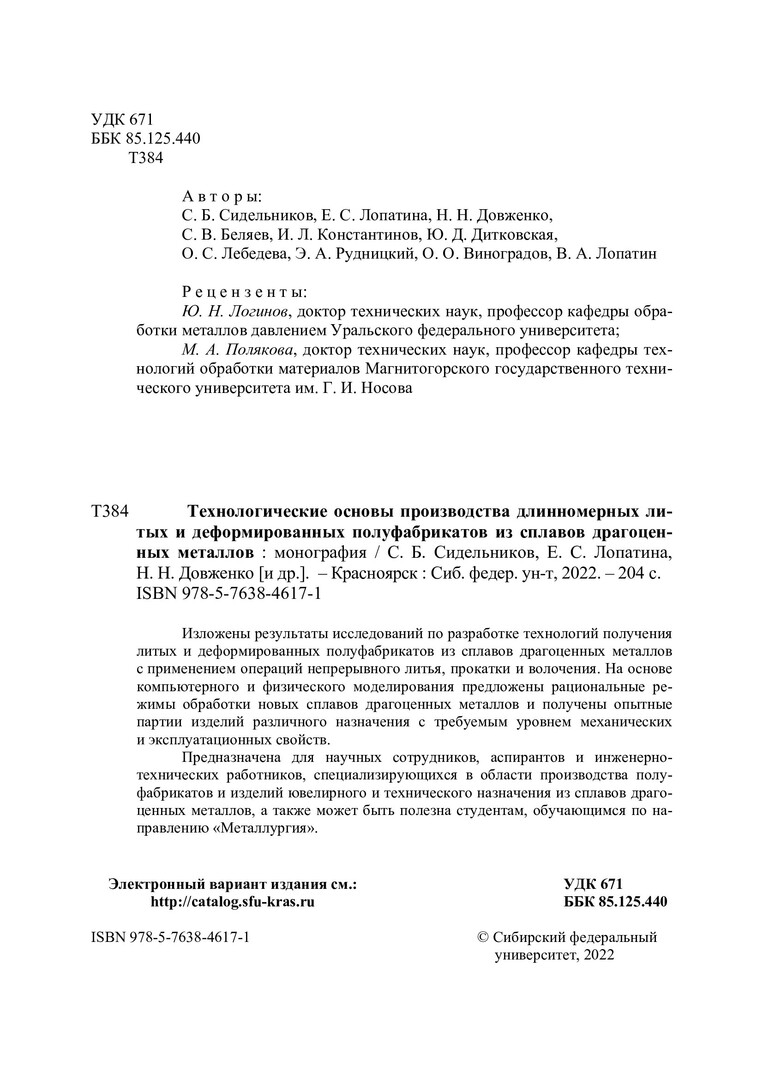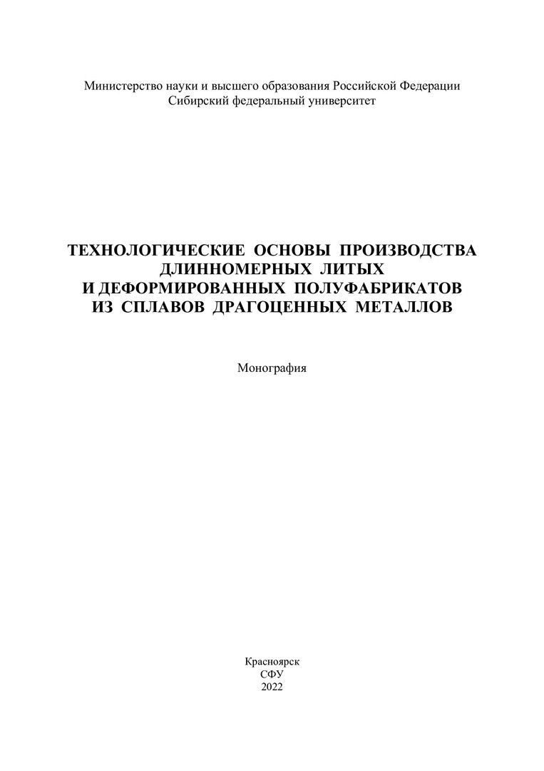 Библиографическое описание: Технологические основы производства длинномерных литых и деформированных полуфабрикатов из сплавов драгоценных металлов : монография / С. Б. Сидельников, Е. С. Лопатина, Н. Н. Довженко [и др.]. ; Сибирский федеральный университет, Институт цветных металлов и материаловедения. - Электрон. текстовые дан. (pdf ; 21,4 Мб). - Красноярск : СФУ, 2022 (2022-04-12). - 204 с., 12.8 усл. печ. л. : граф., цв. ил., рис., табл. - Загл. с титул. экрана. - Электрон. версия печ. публикации . - Библиогр.: с. 190-201. - 500 экз. - ISBN 978-5-7638-4617-1 : Б. ц. - Изд. № 2021-15090. - Текст : электронный.