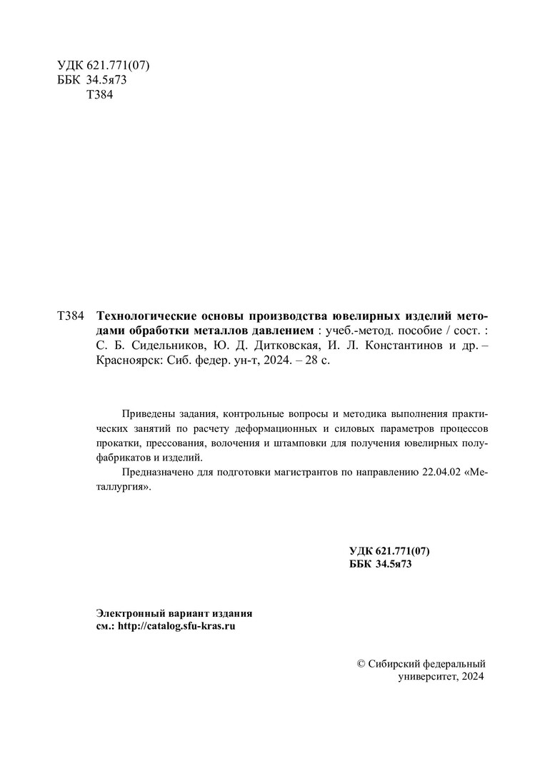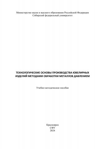 Библиографическое описание: Технологические основы производства ювелирных изделий методами обработки металлов давлением : учебно-методическое пособие / сост. С. Б. Сидельников [и др.]. - Электрон. текстовые дан. (1,4 Мб). - Красноярск : СФУ, 2024 (2024-10-22). - 28 с. - Загл. с титул. экрана. - Электрон. версия печ. публикации . - Библиогр.: с. 24. - 100 экз. - Изд. № 2024-22920 : Б. ц. - Текст : электронный.
